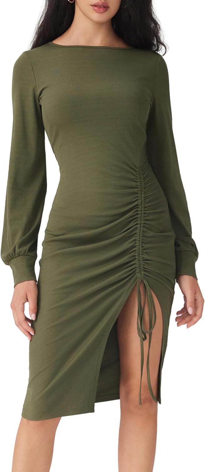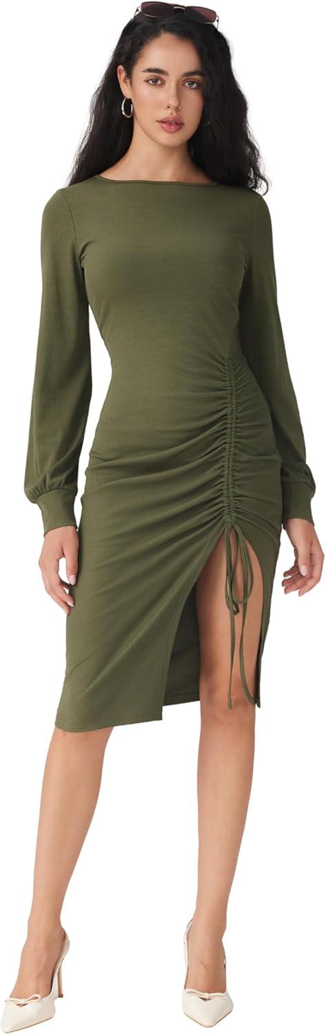 CIDER Bodycon Dress for Women Ruched Long Sleeve Boat Neck Drawstring Midi Semi Formal Dresses Fall Trendy(Green)