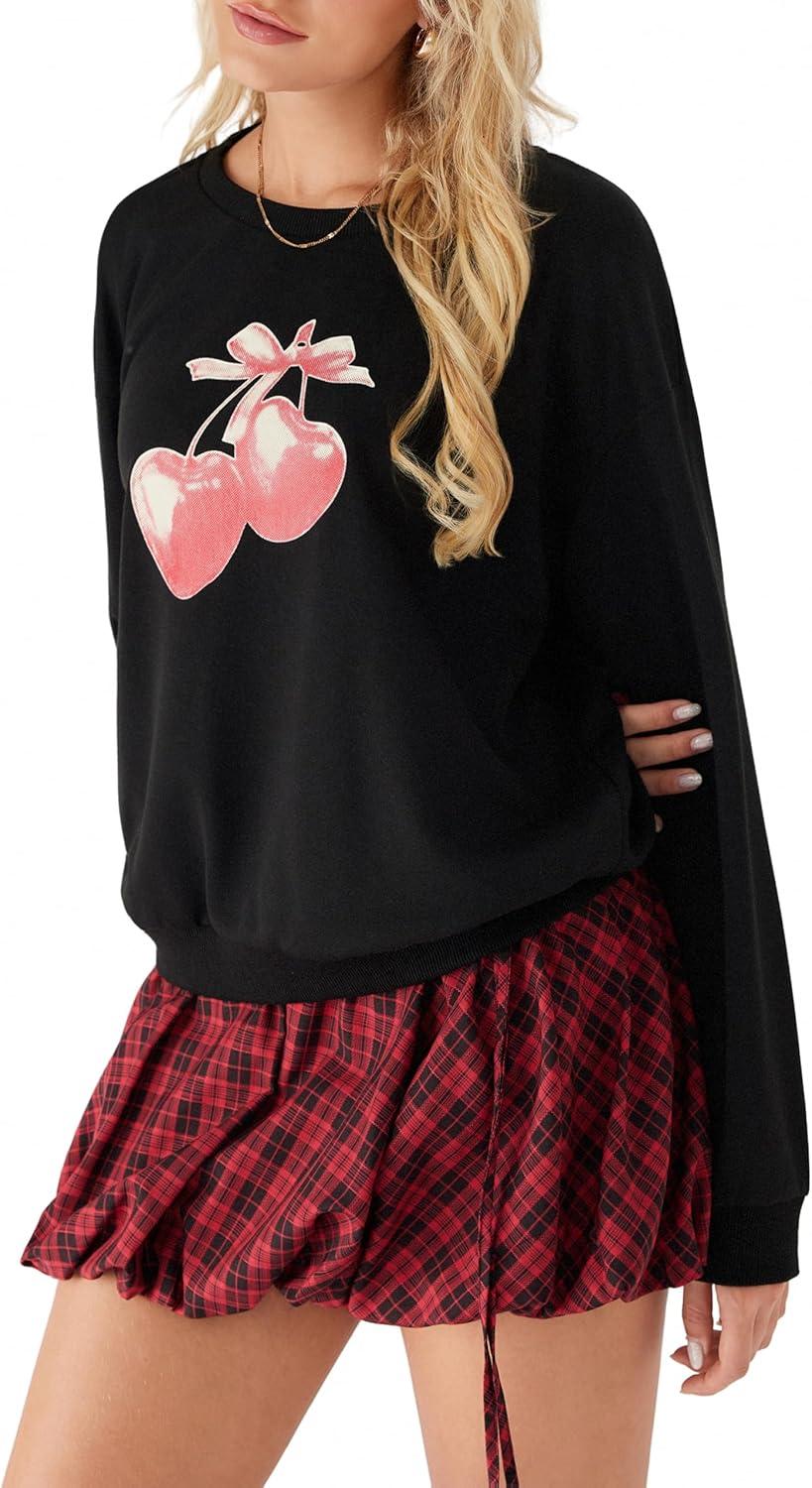 CIDER Cherry Sweatshirt for Women Cute Sweatshirts Long Sleeve Crew Neck Graphic Pullover Y2K Tops Trendy Fall Outfits(Black)
