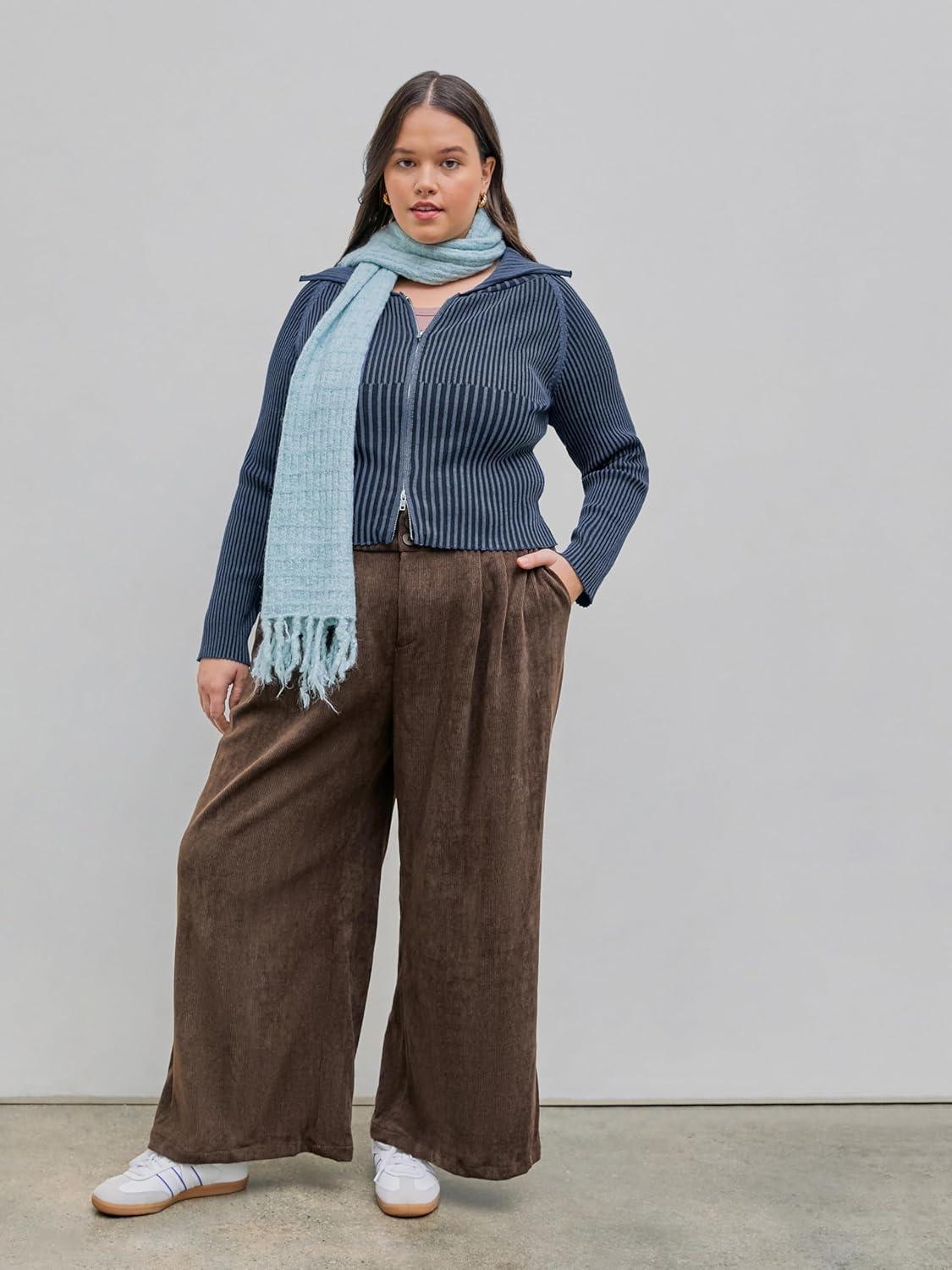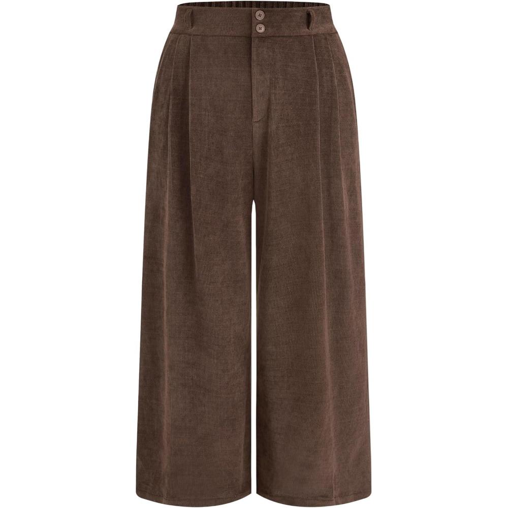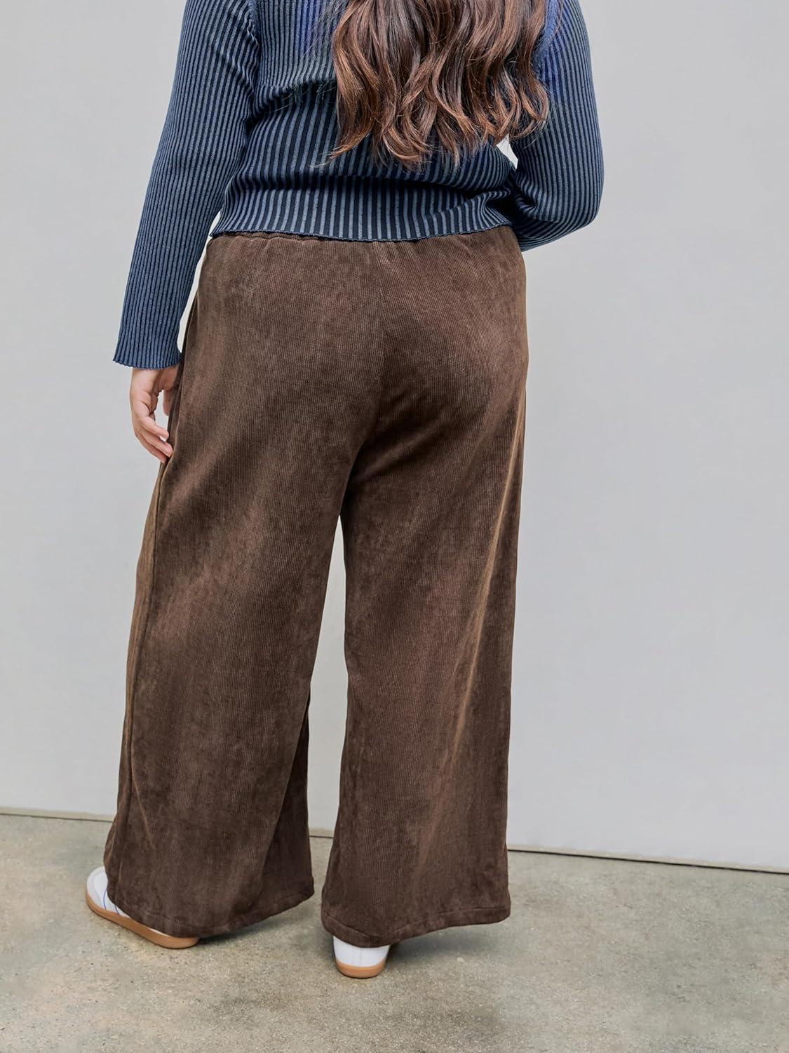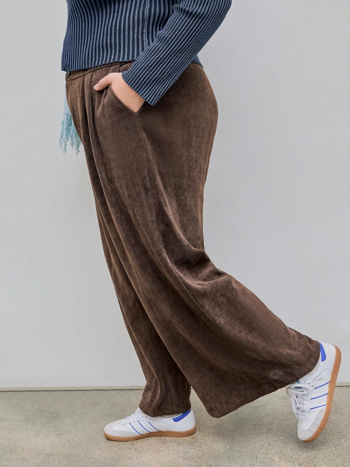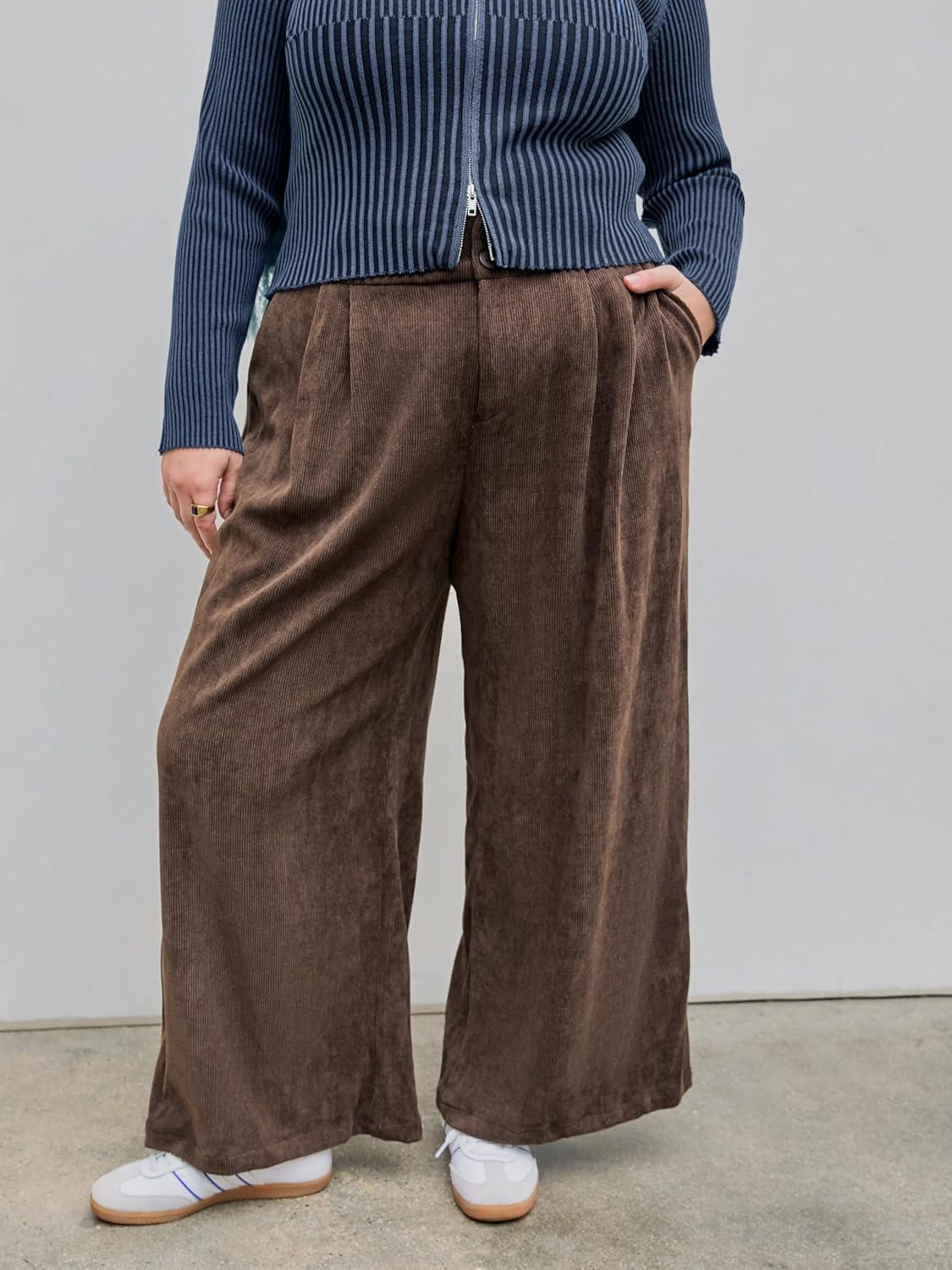 CIDER Corduroy High Waist Solid Pleated Wide Leg Trousers Curve & Plus(Brown)