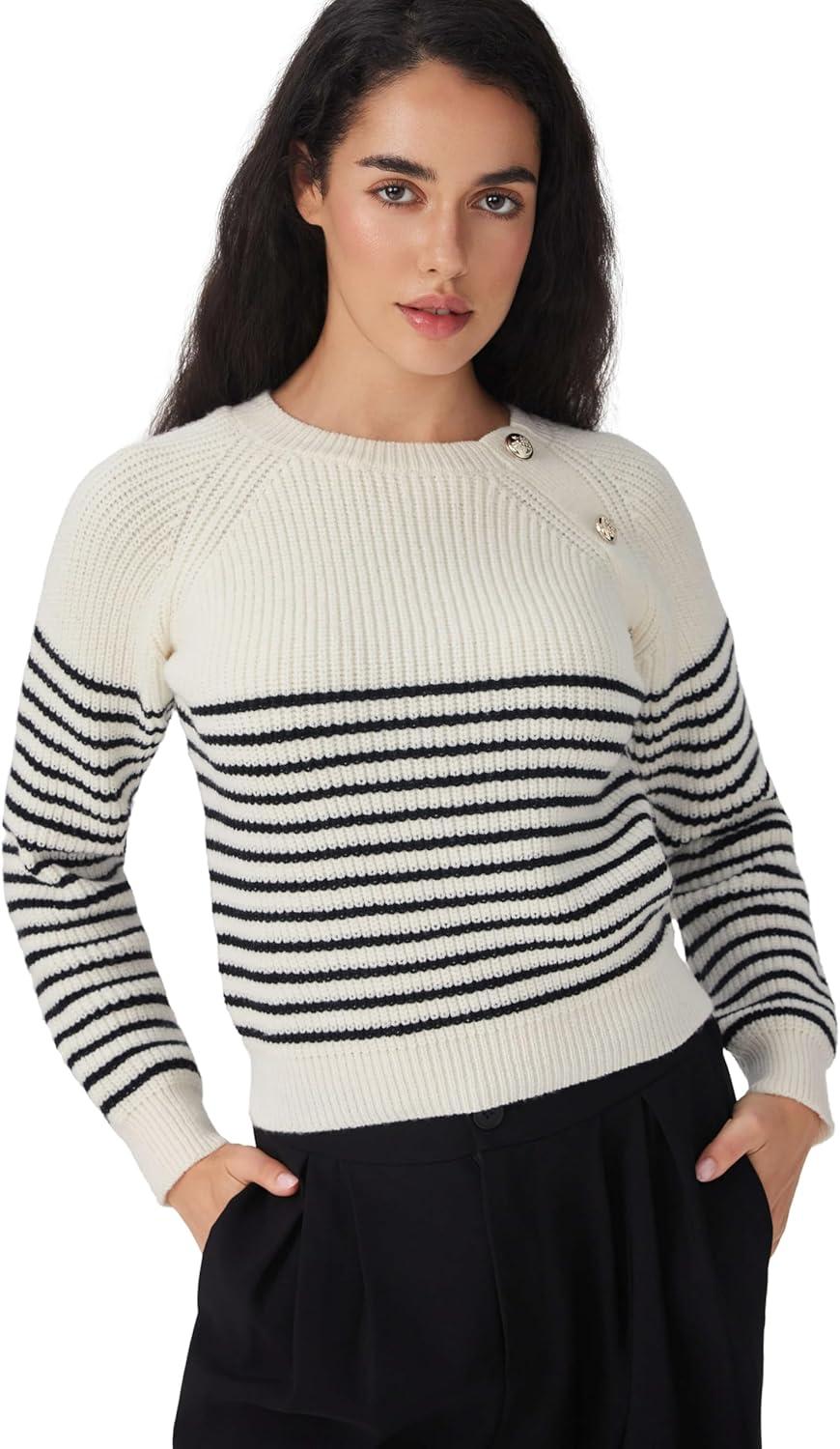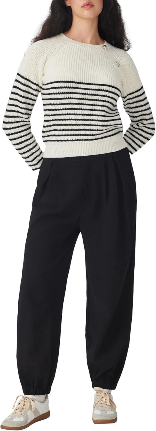 CIDER Cropped Sweaters for Women Fall Striped Crewneck Long Sleeve Sweater Fitted Pullover Sweaters Trendy Fall Outfits(White)