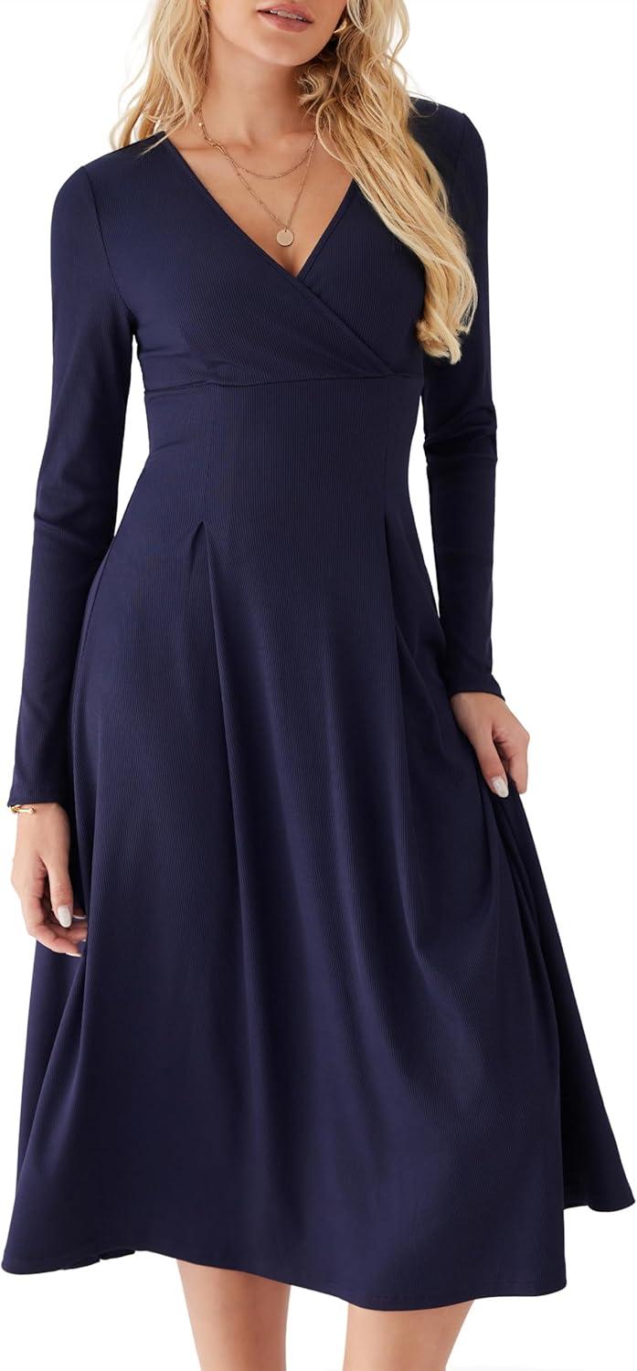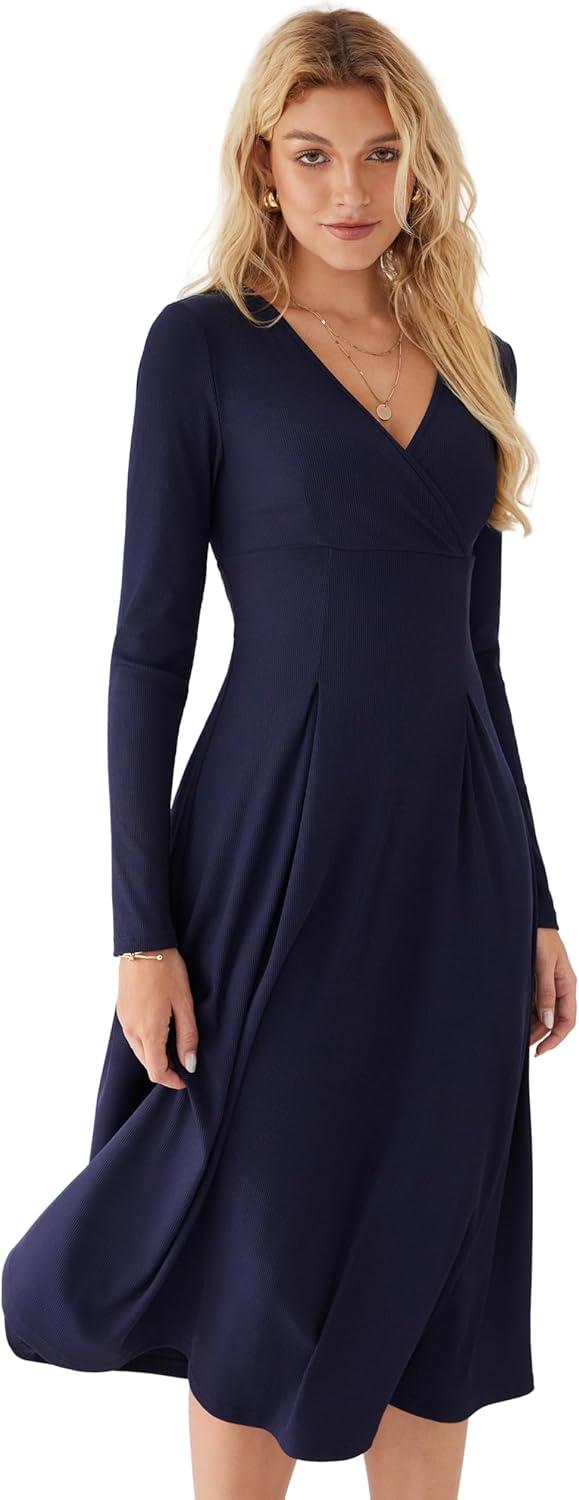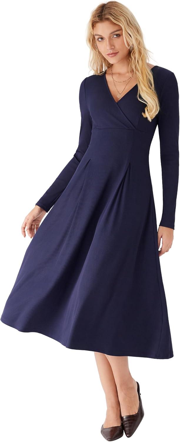CIDER Elegant Wrap Dress Long Sleeve Midi Dress for Women(Blue)