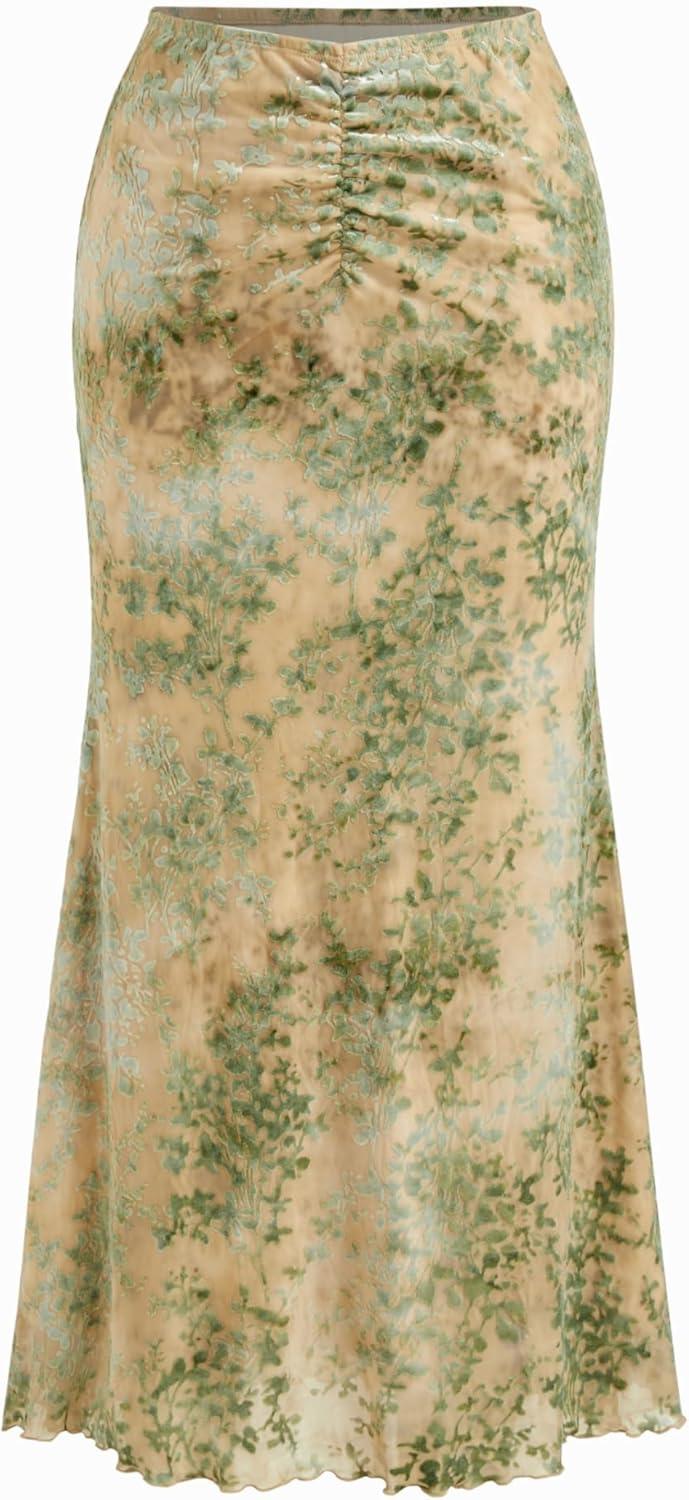 CIDER High Waist Skirts for Women Mermaid Skirt Fishtail Ruched Bodycon Long Maxi Skirt Lettuce Trim Stretchy(Floral Light Green)