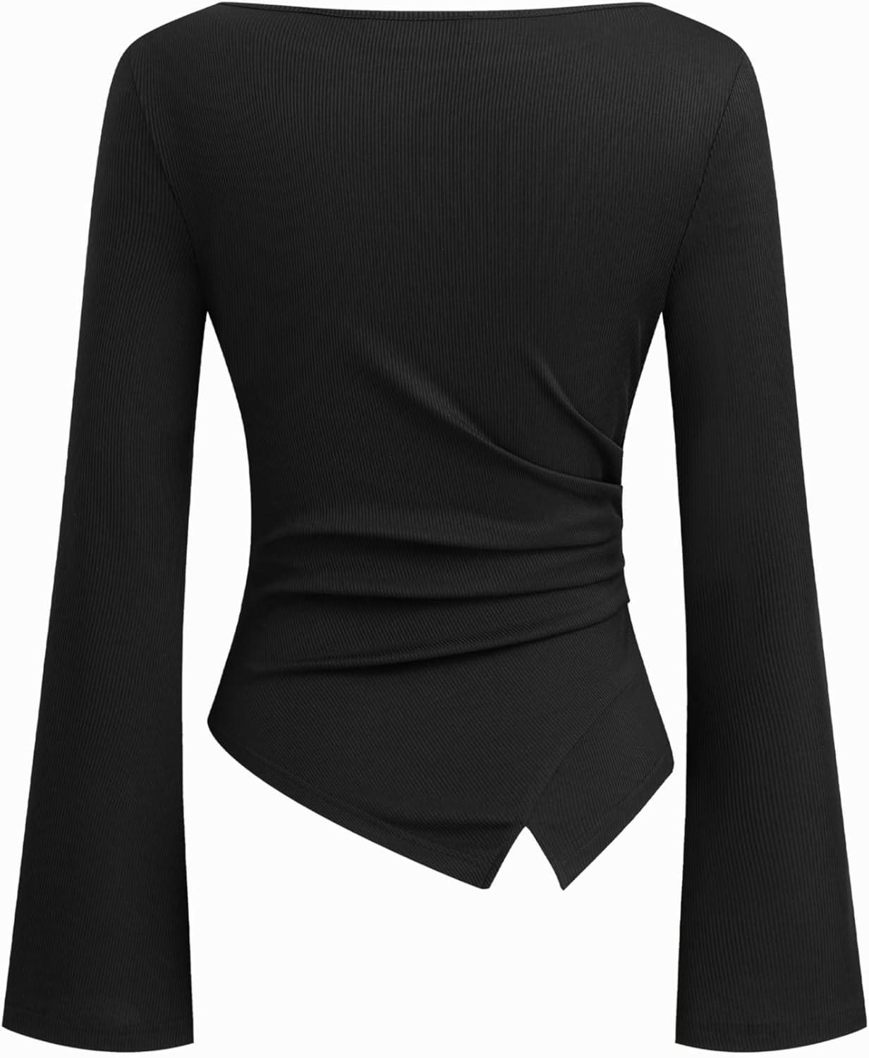 CIDER Long Sleeve Ribbed Knit Top Stylish Fashion Going Out Shirt for Women(Black)