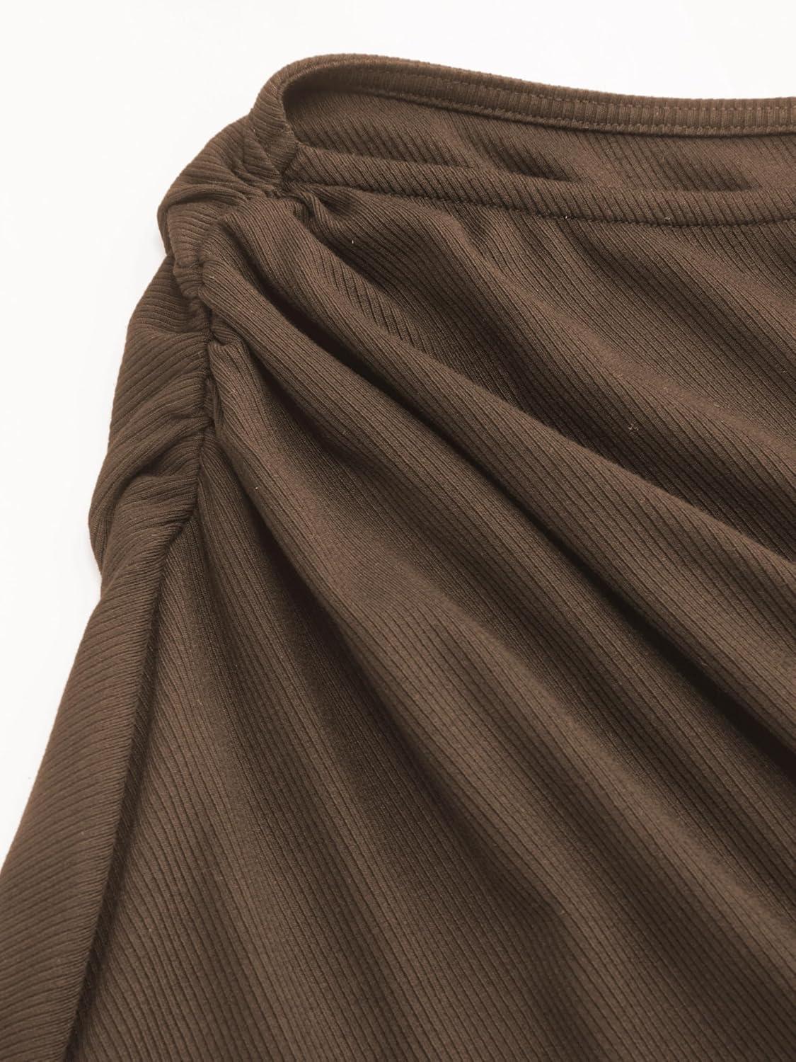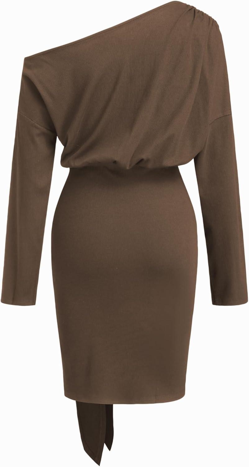 CIDER Off The Shoulder Dresses for Women One Shoulder Going Out Dress Tie Front Long Sleeve Dresses Fall Outfits(Brown)