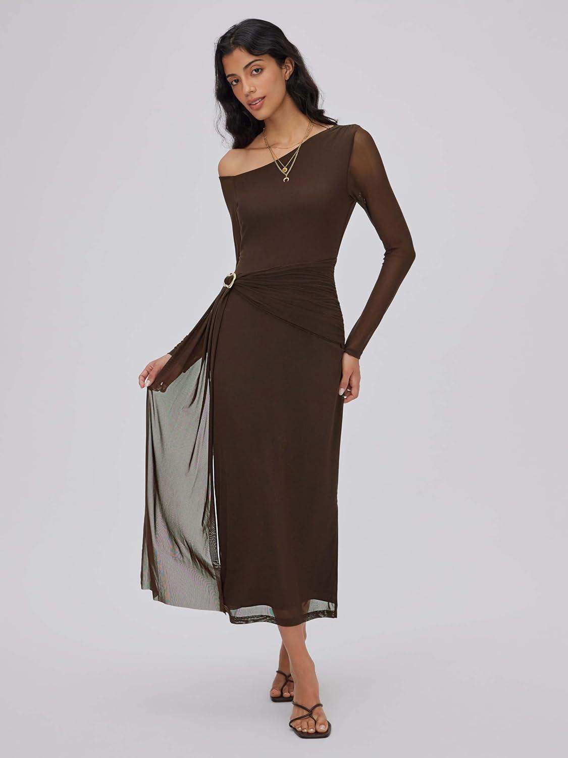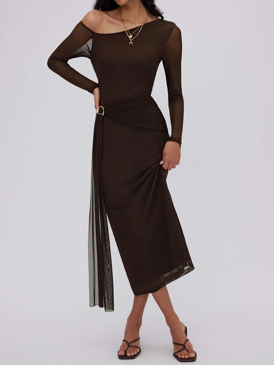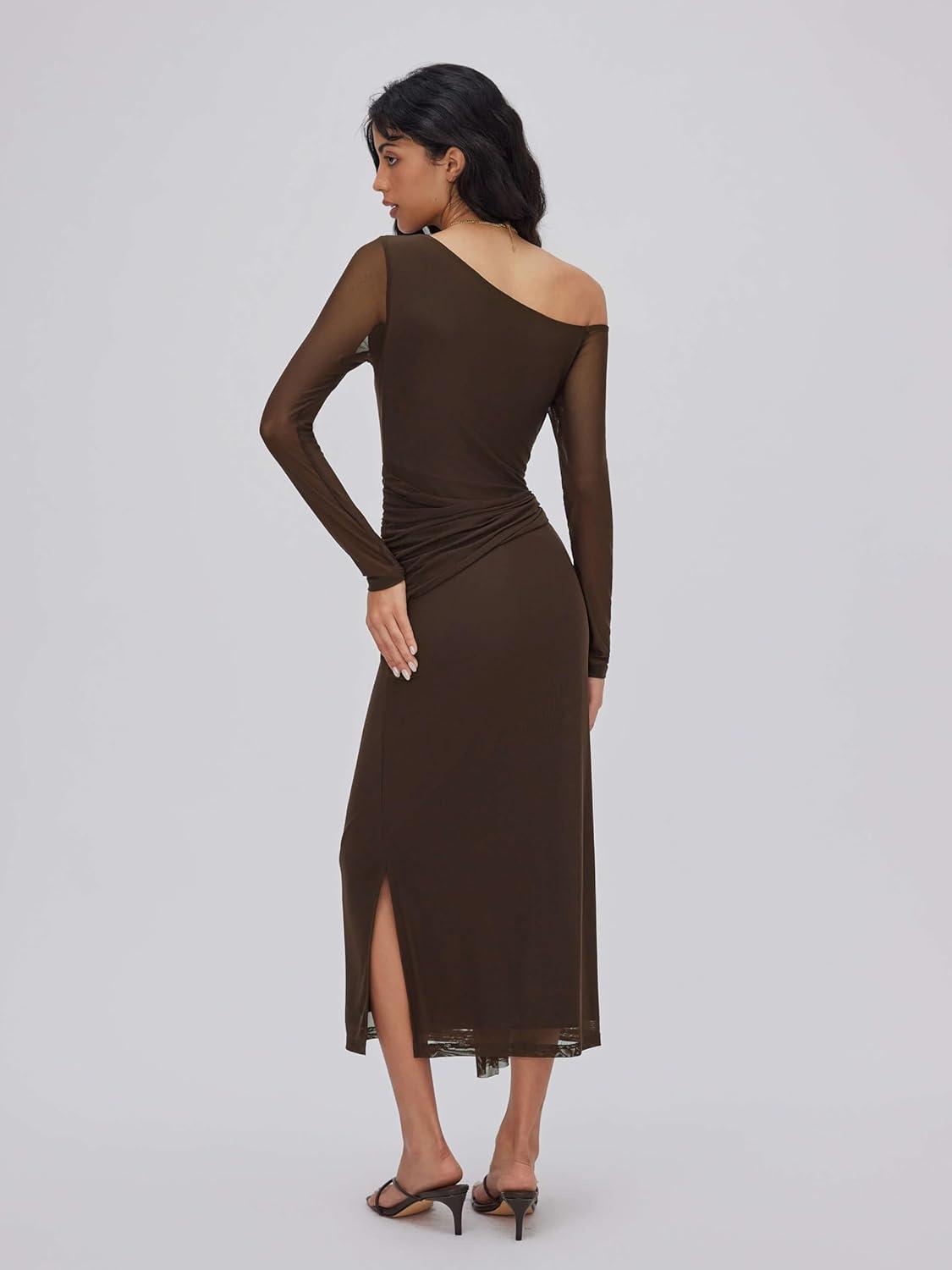 CIDER One Shoulder Long Sleeve Midi Dress Women’s Elegant Sheer Bodycon Party Dress(Brown)