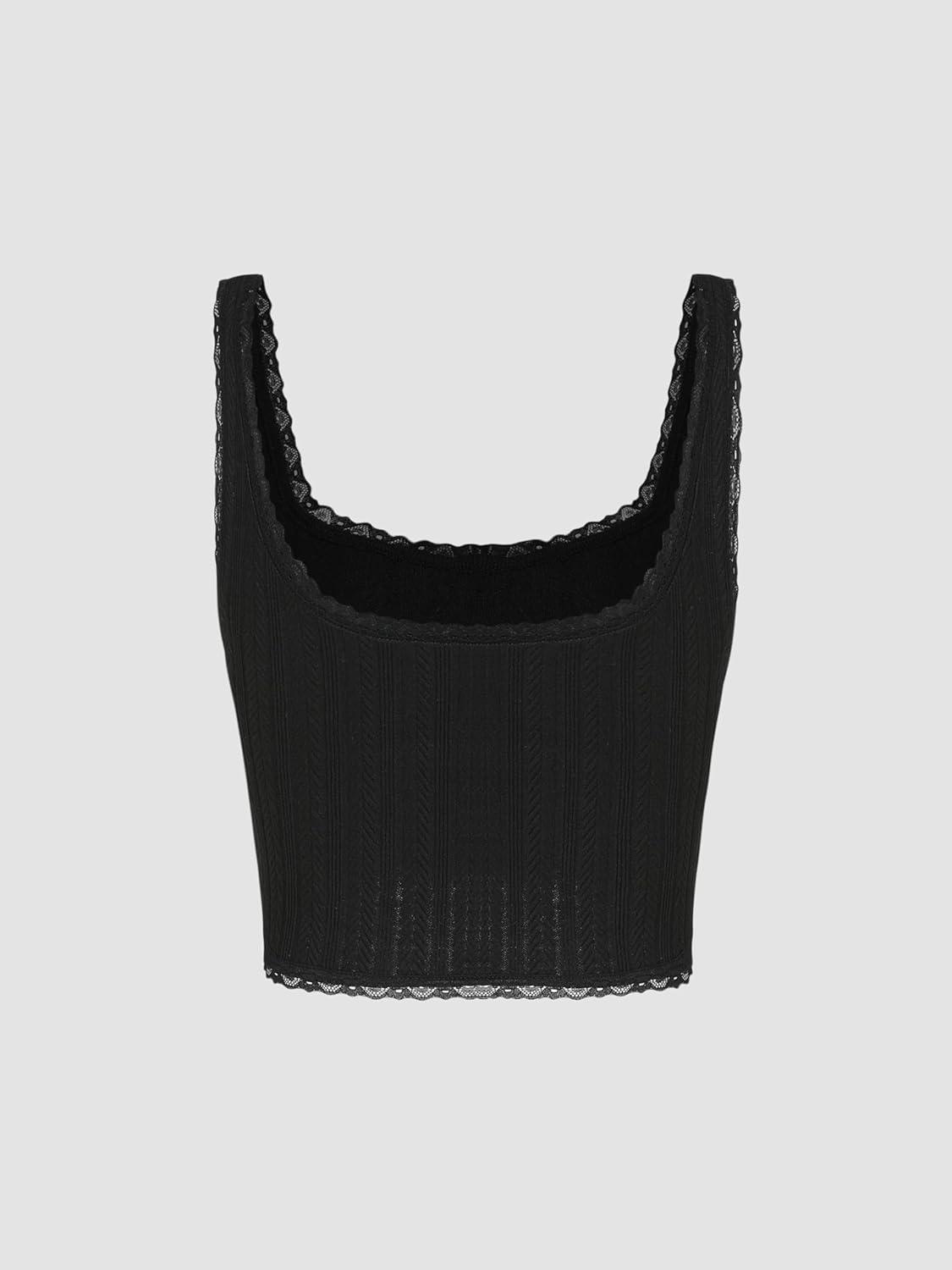 CIDER Solid Lace Trim Bowknot Rib Knit Tank Top(Black)
