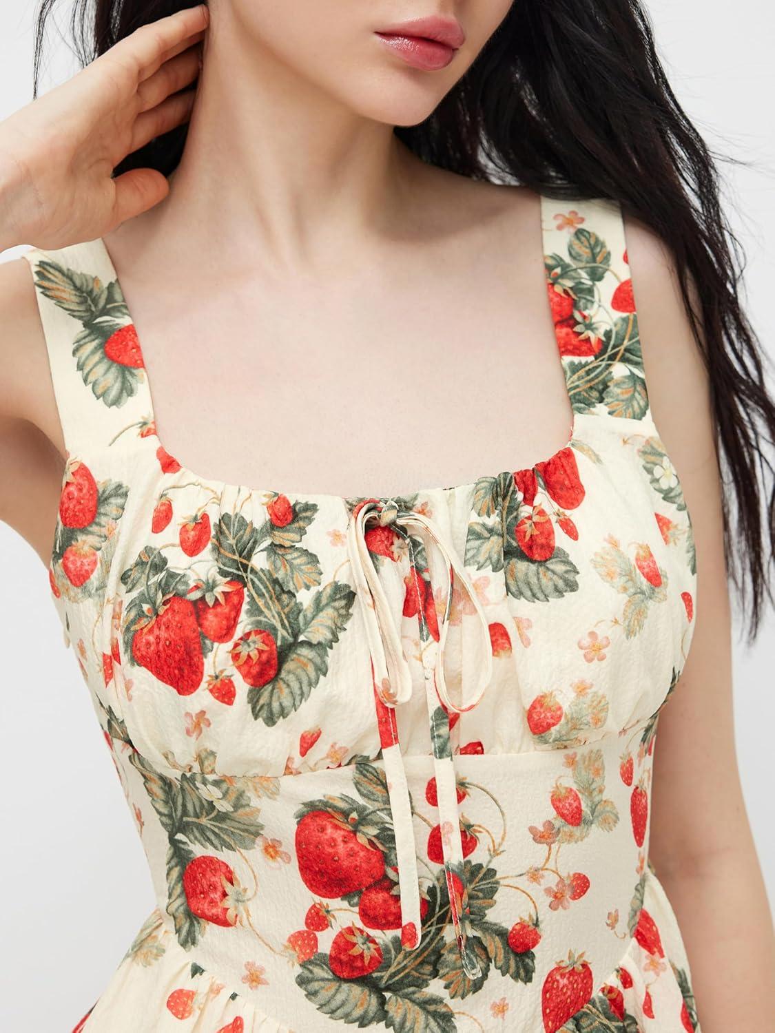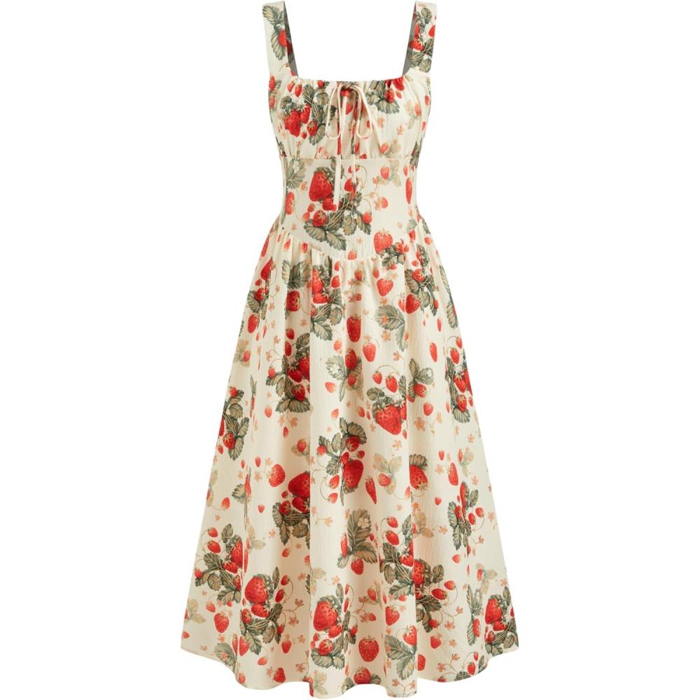 CIDER Strawberry Print Midi Dress Women’s Sleeveless Summer Dress(Beige)