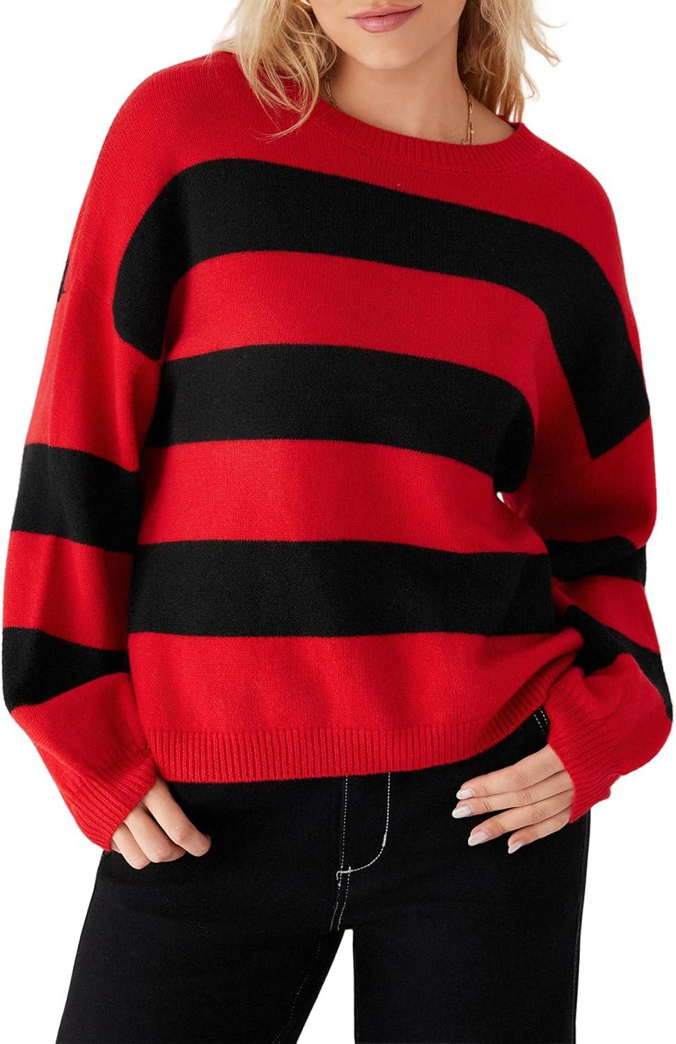 CIDER Striped Sweaters for Women Cute Long Sleeve Crew Neck Knit Lightweight Pullover Sweater Tops Fall Outfits Trendy(Black & Wine)