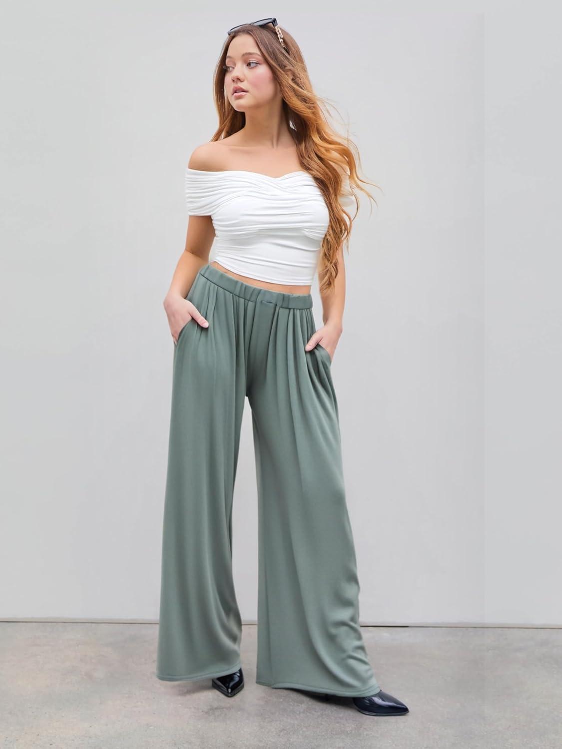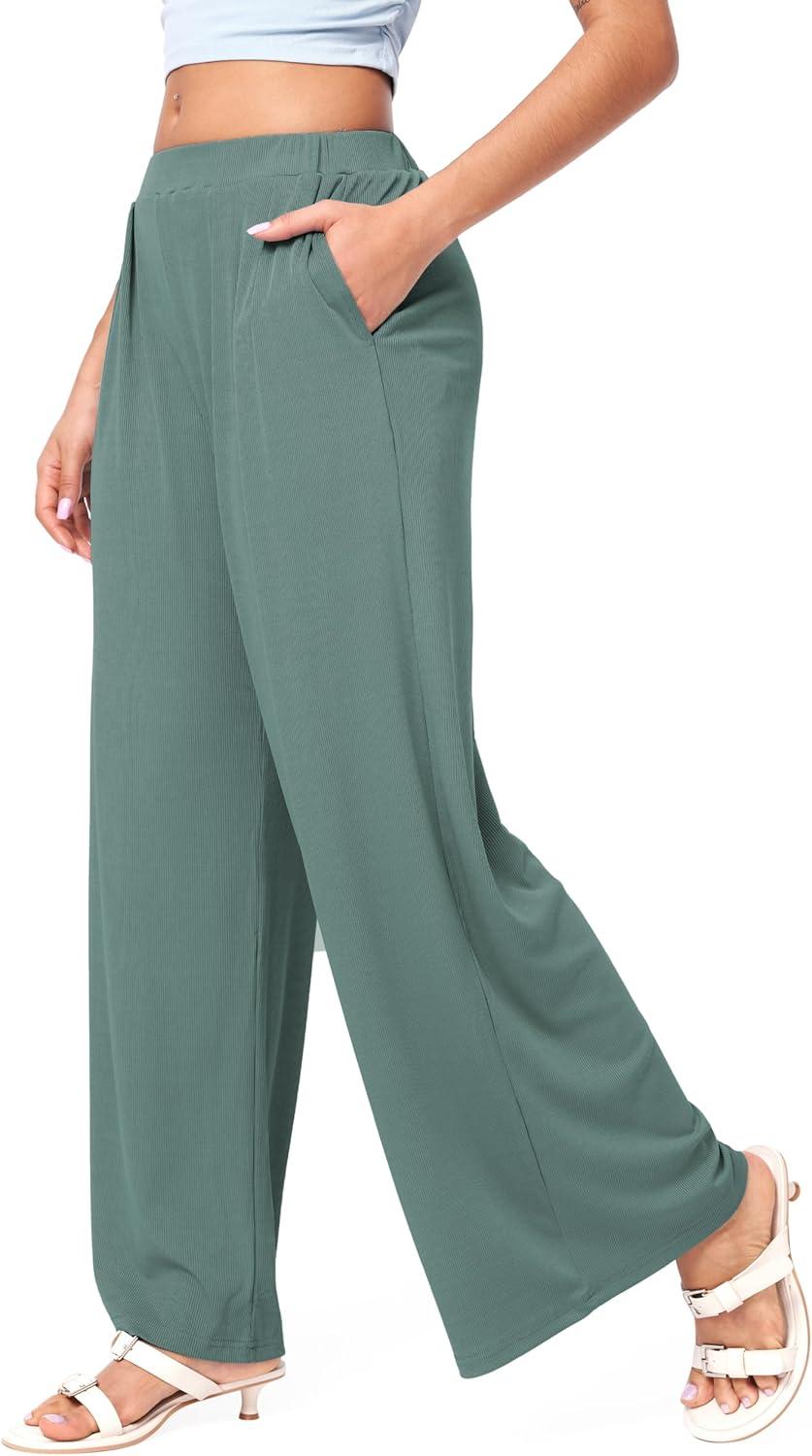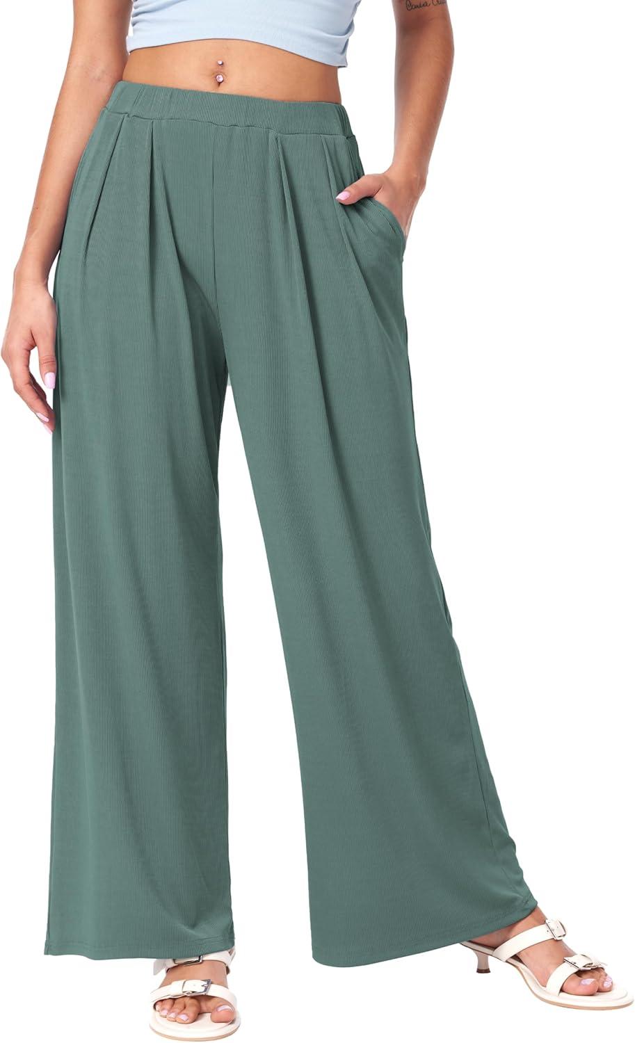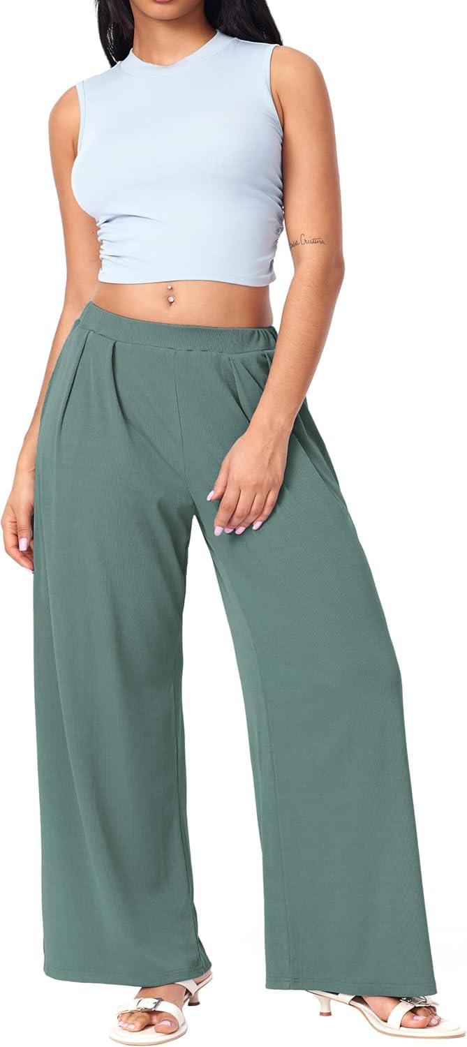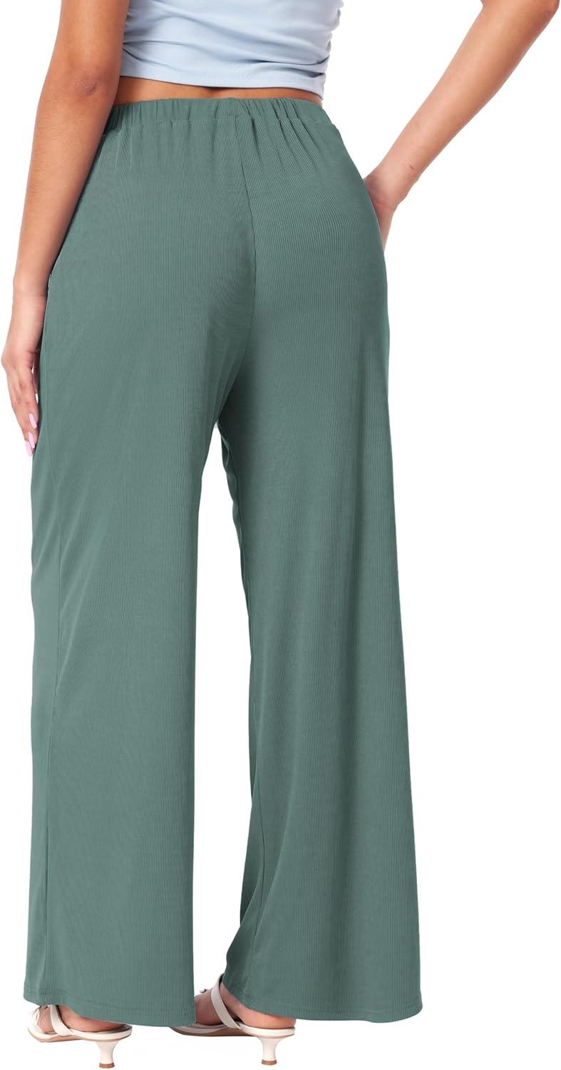 CIDER Wide Leg Palazzo Pants for Women with Pockets Elastic Business Causal Pants Women Summer for Beach Travel Trousers(Pale Green)
