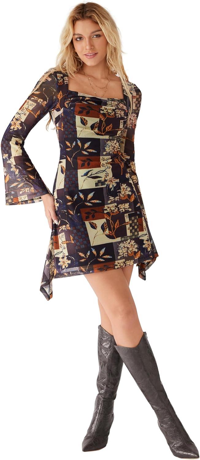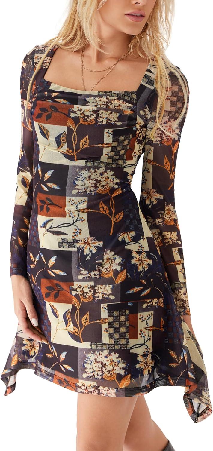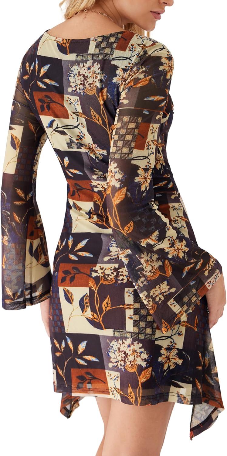 CIDER Women Bell Sleeve Floral Dress Square Neck Mesh Mini Dresses Bodycon Y2k Boho Fall Fashion Going Out Party Outfit(Brown)