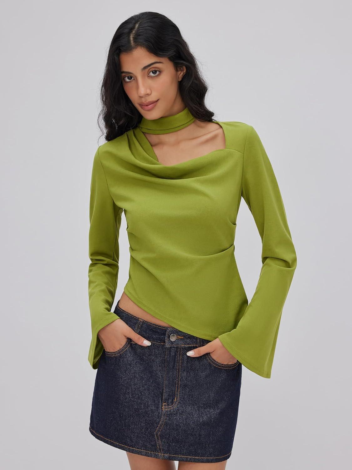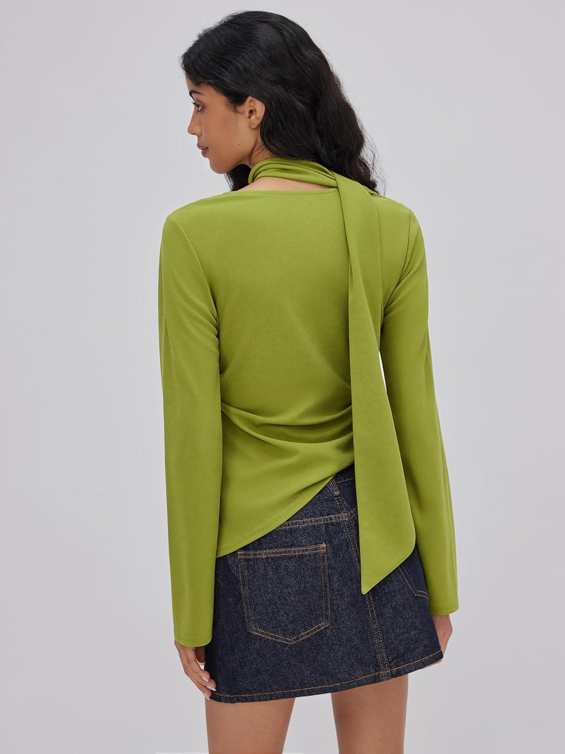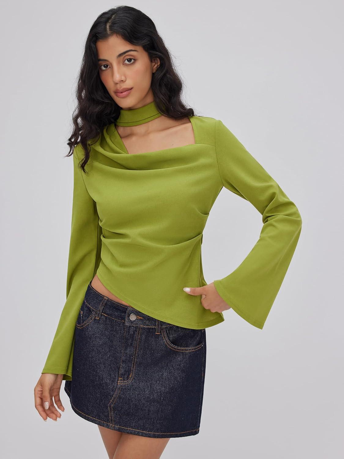 CIDER Women Long Sleeve Cowl Neck Top Stylish Wrap Front Design(Matcha Green)
