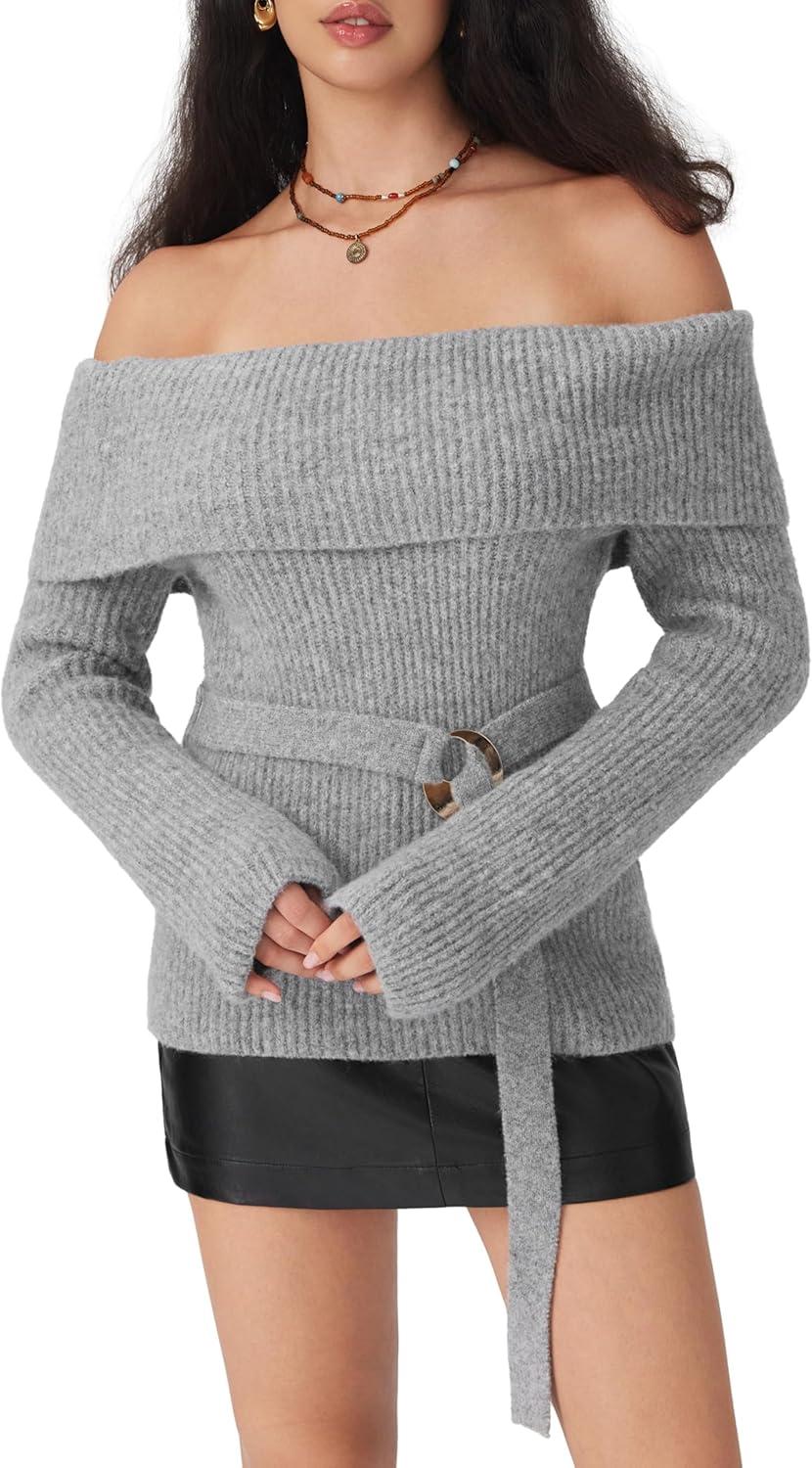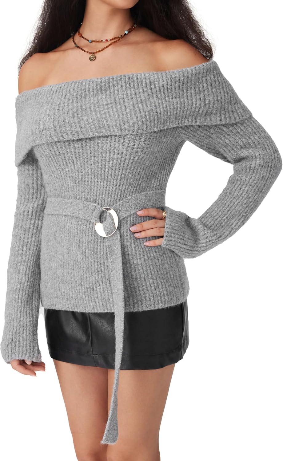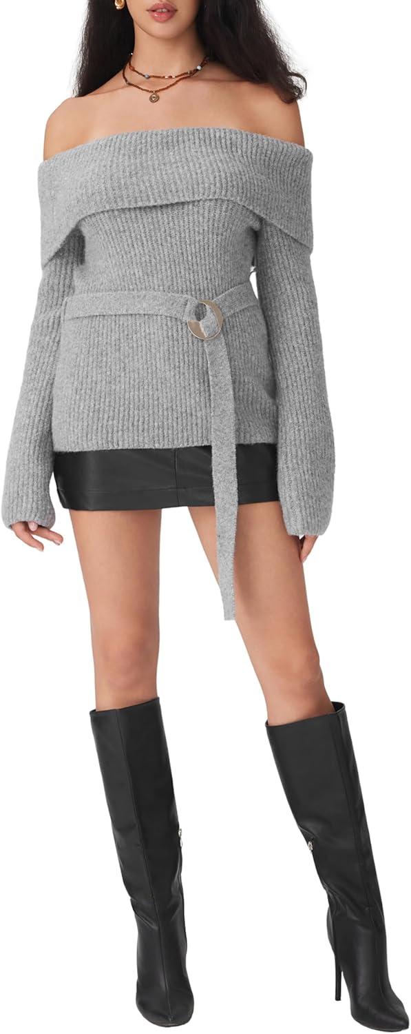 CIDER Women Off Shoulder Sweaters Long Sleeve Ribbed Knit Going Out 2025 Fall Tops with Belt(Dark Grey)