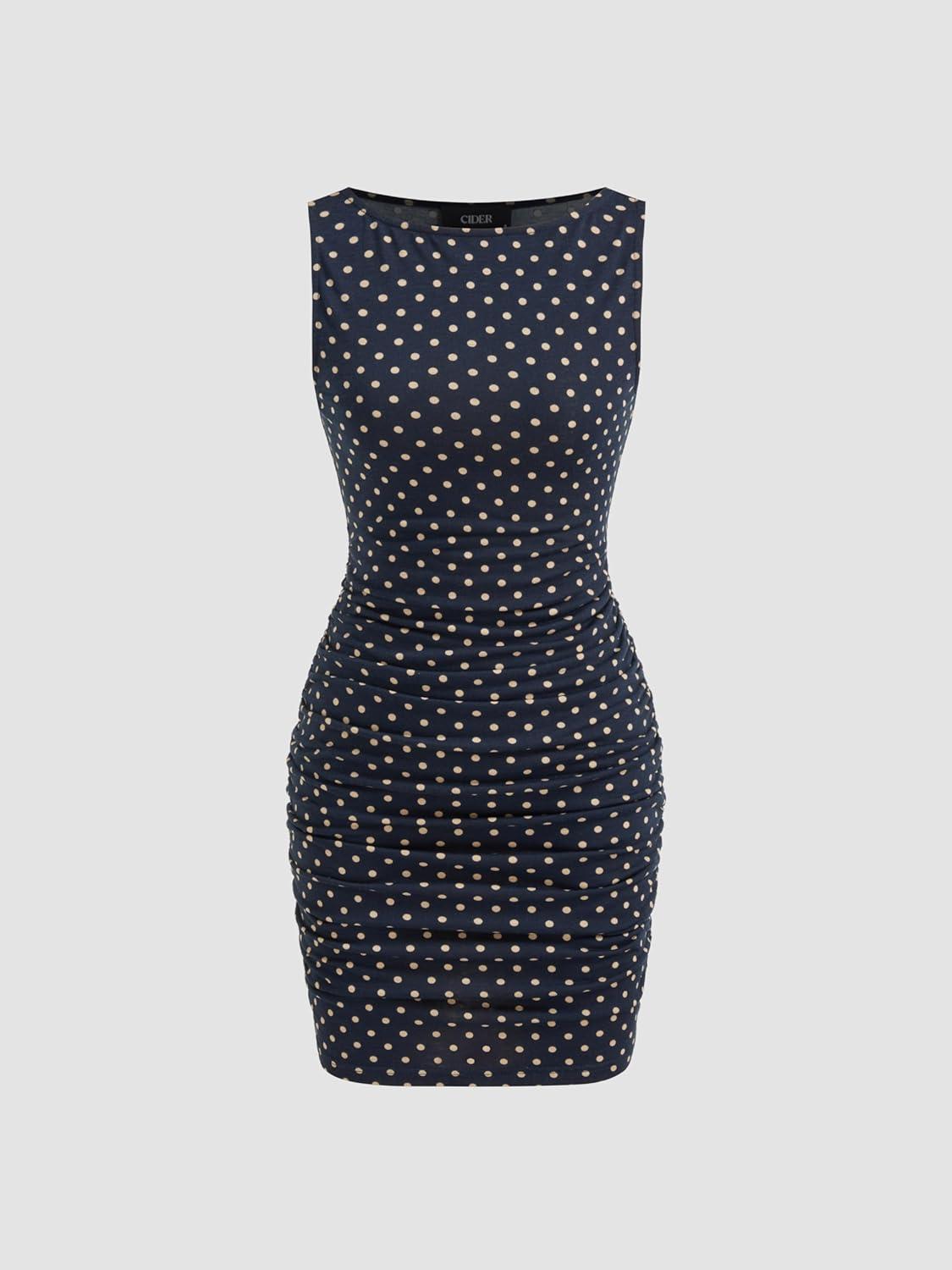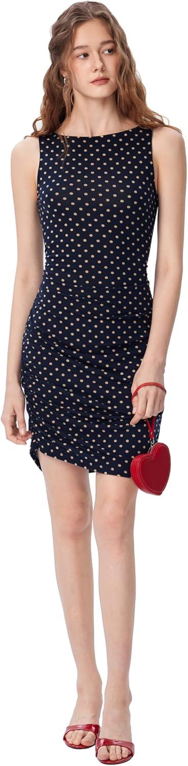 CIDER Women Sleeveless Polka Dot Mini Dress Ruched Bodycon Boat Neck Cocktail Party Dresses(Blue)
