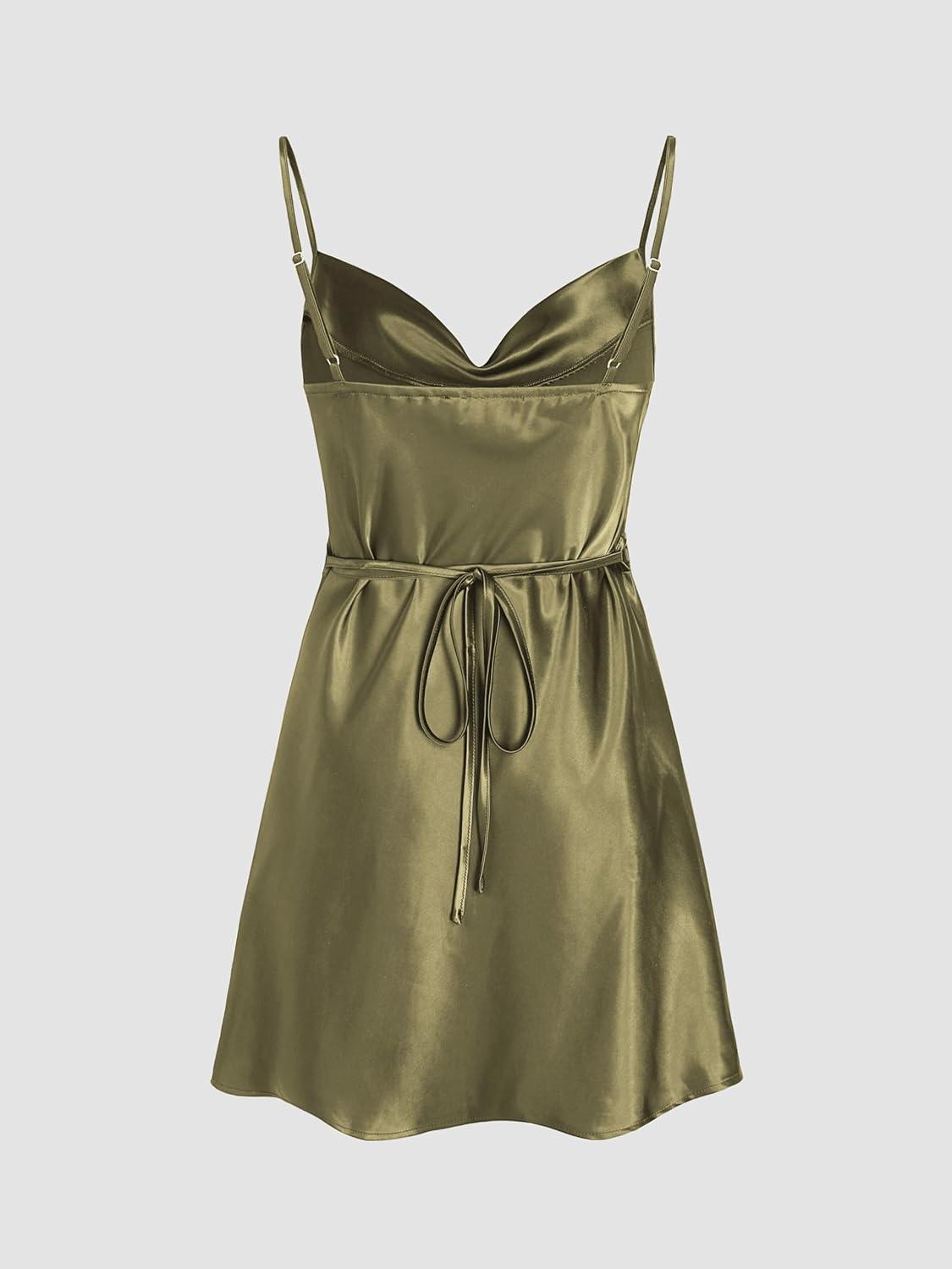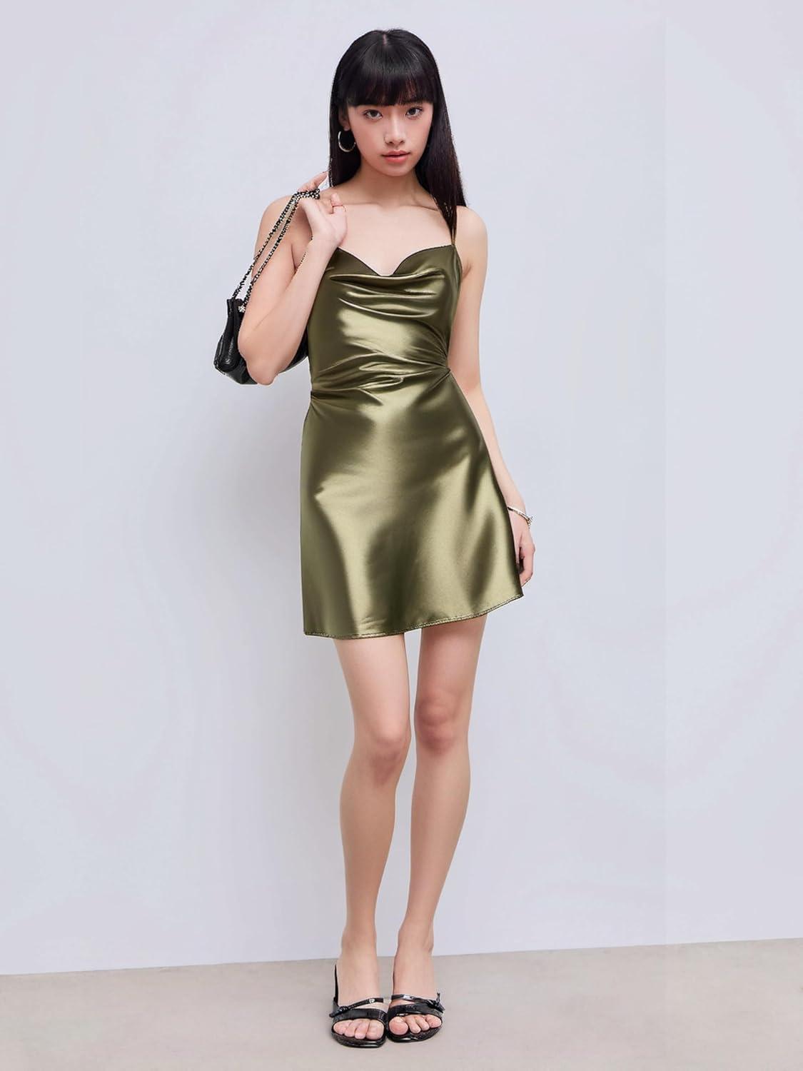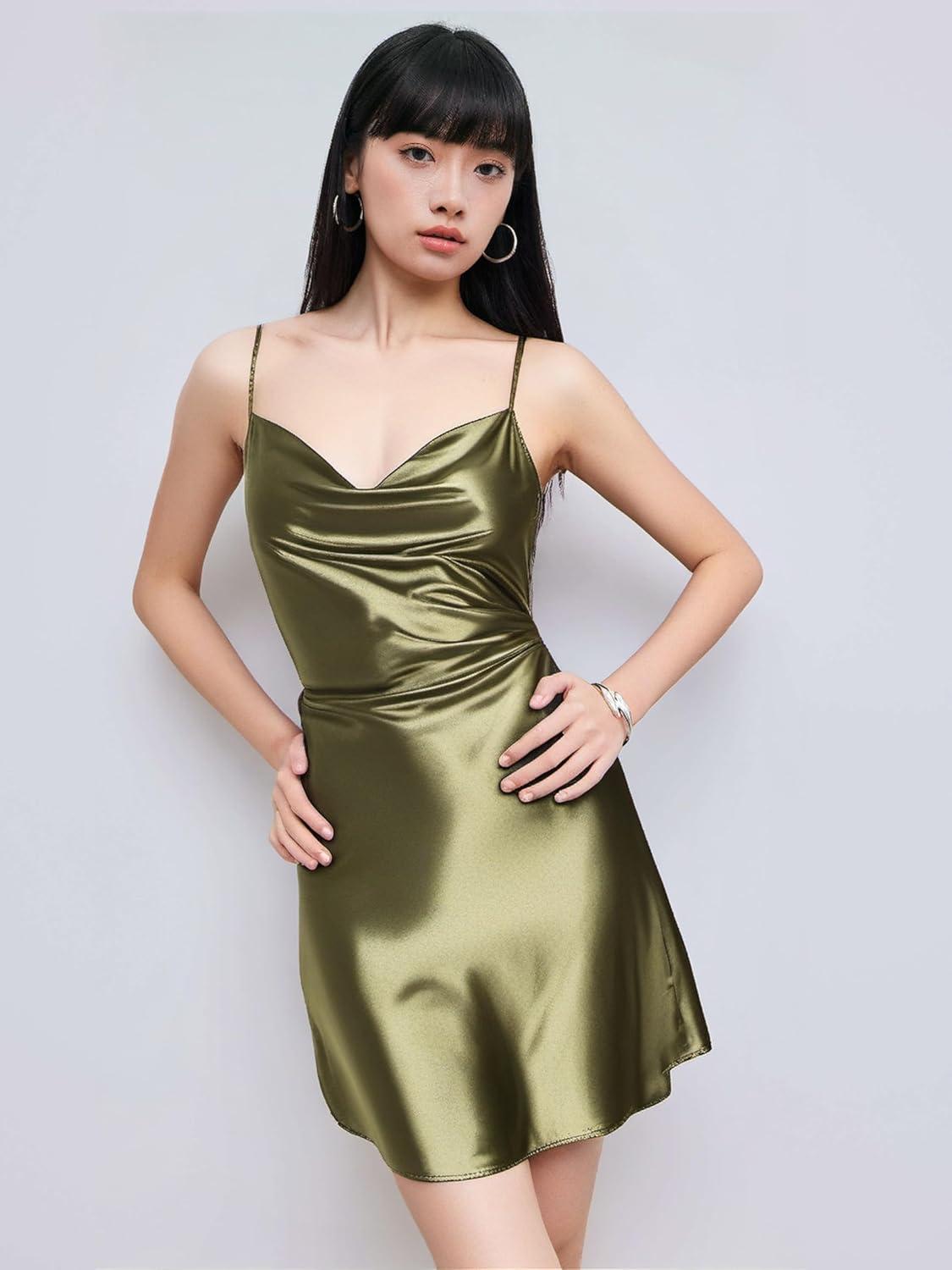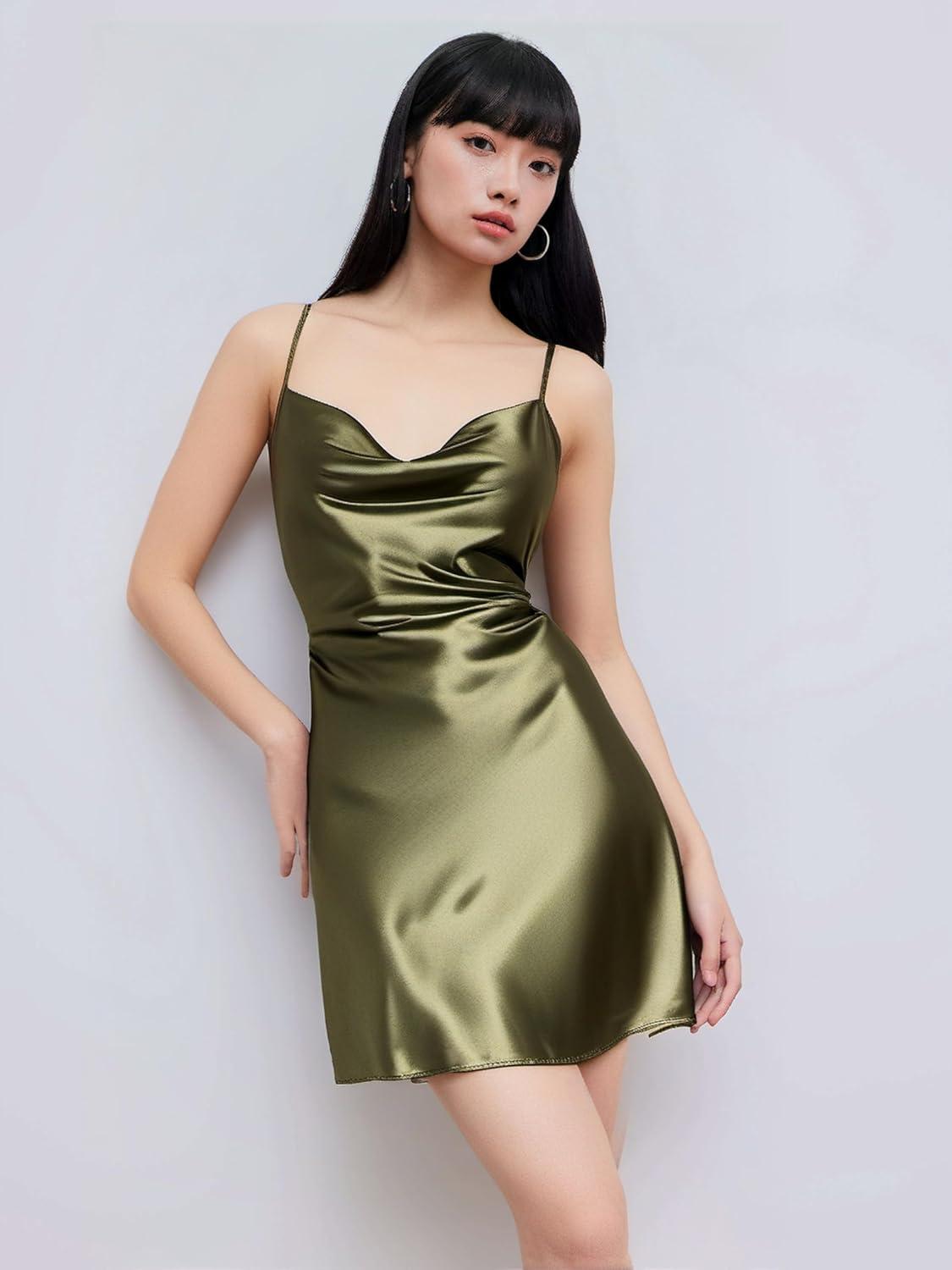 CIDER Women Summer 2025 Wedding Guest Cocktail Dresses Solid Satin Cowl Neck Cami Mini Dress(Green)