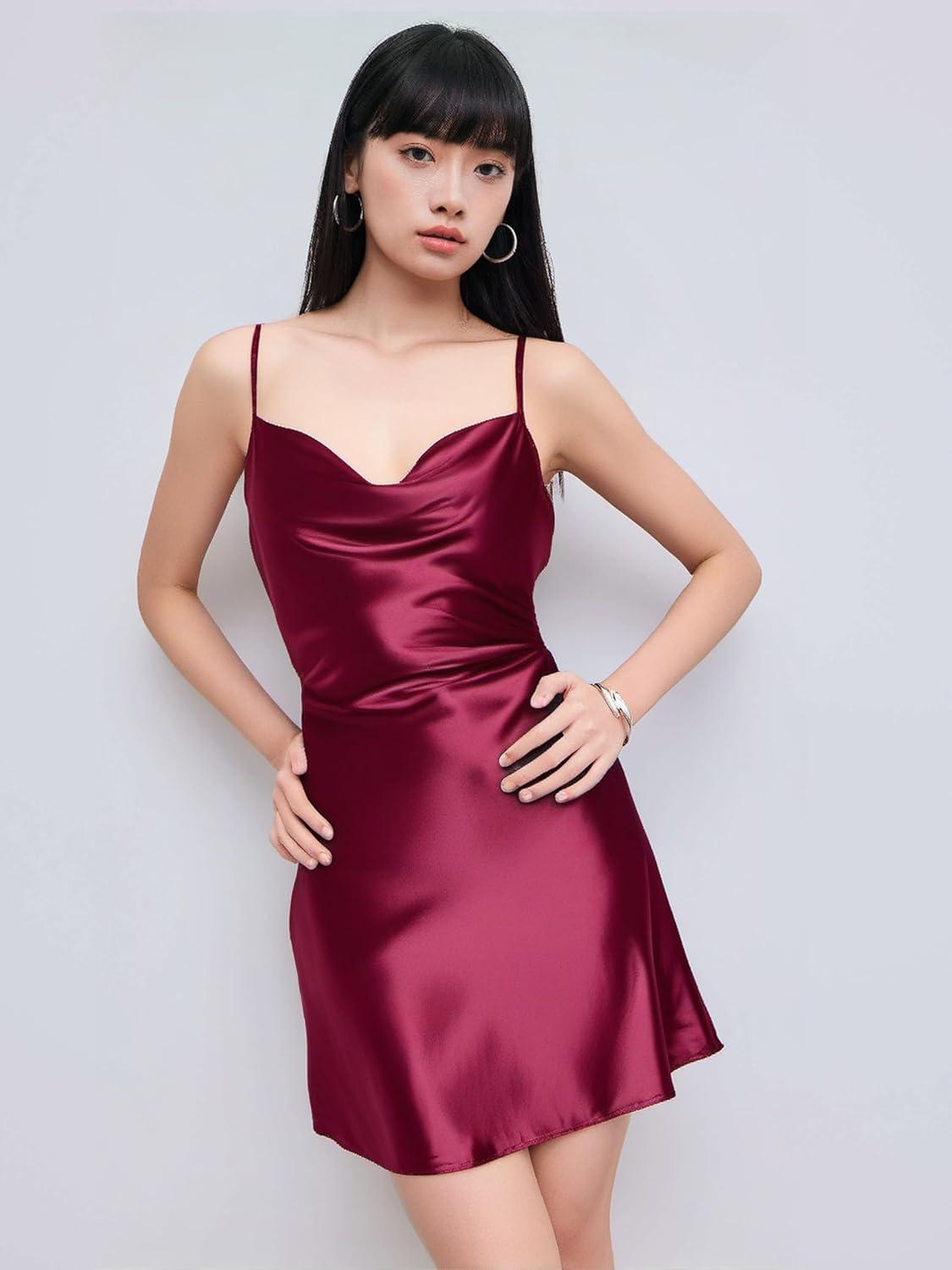 CIDER Women Summer 2025 Wedding Guest Cocktail Dresses Solid Satin Cowl Neck Cami Mini Dress(Wine)