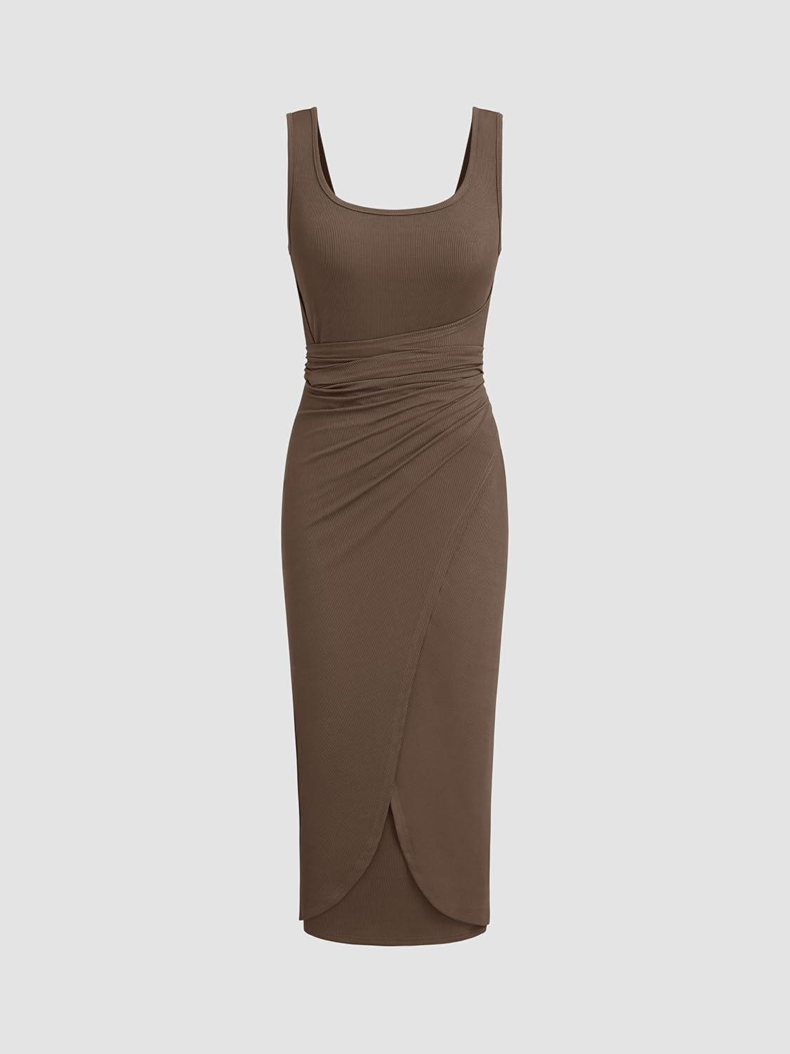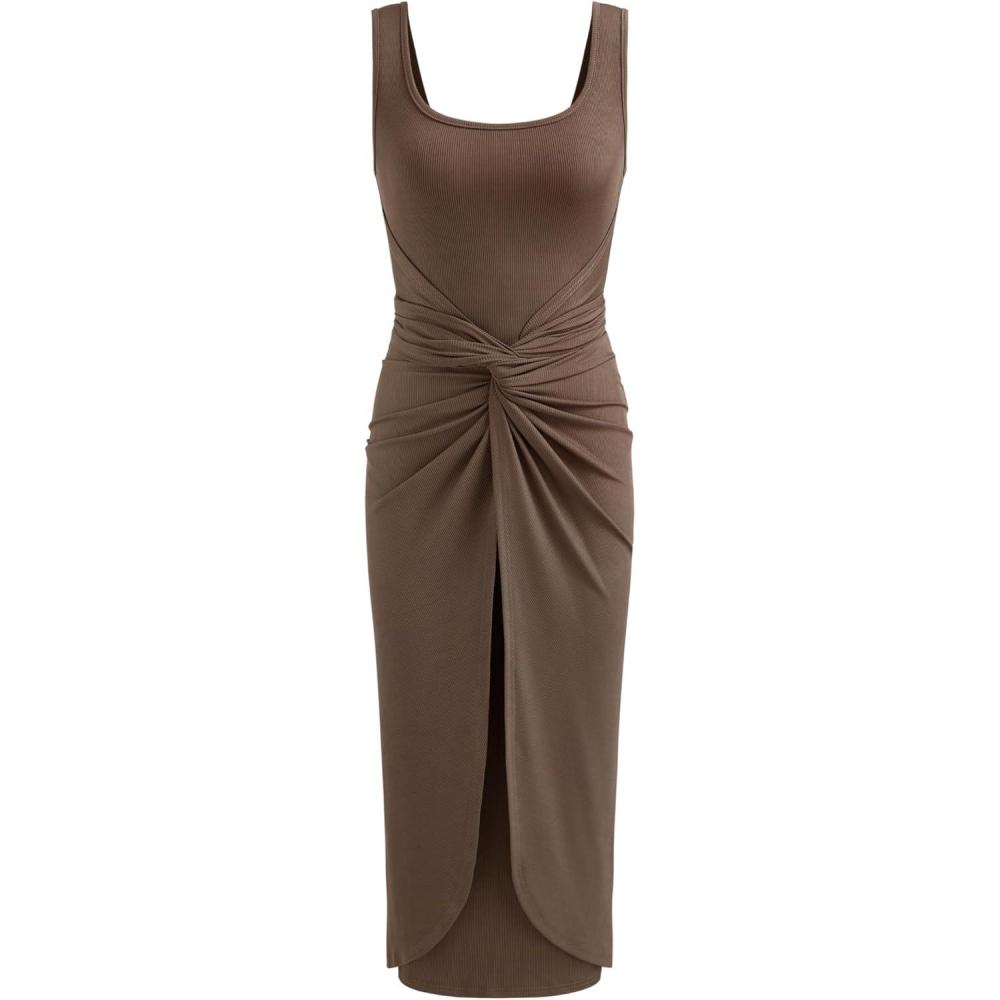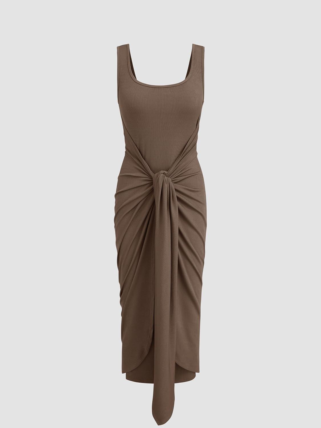 CIDER Women’s Bodycon Dress Square Neck Twist Knotted Ruched Sleeveless Maxi Tank Elegant Long Summer Dresses 2025(Brown)