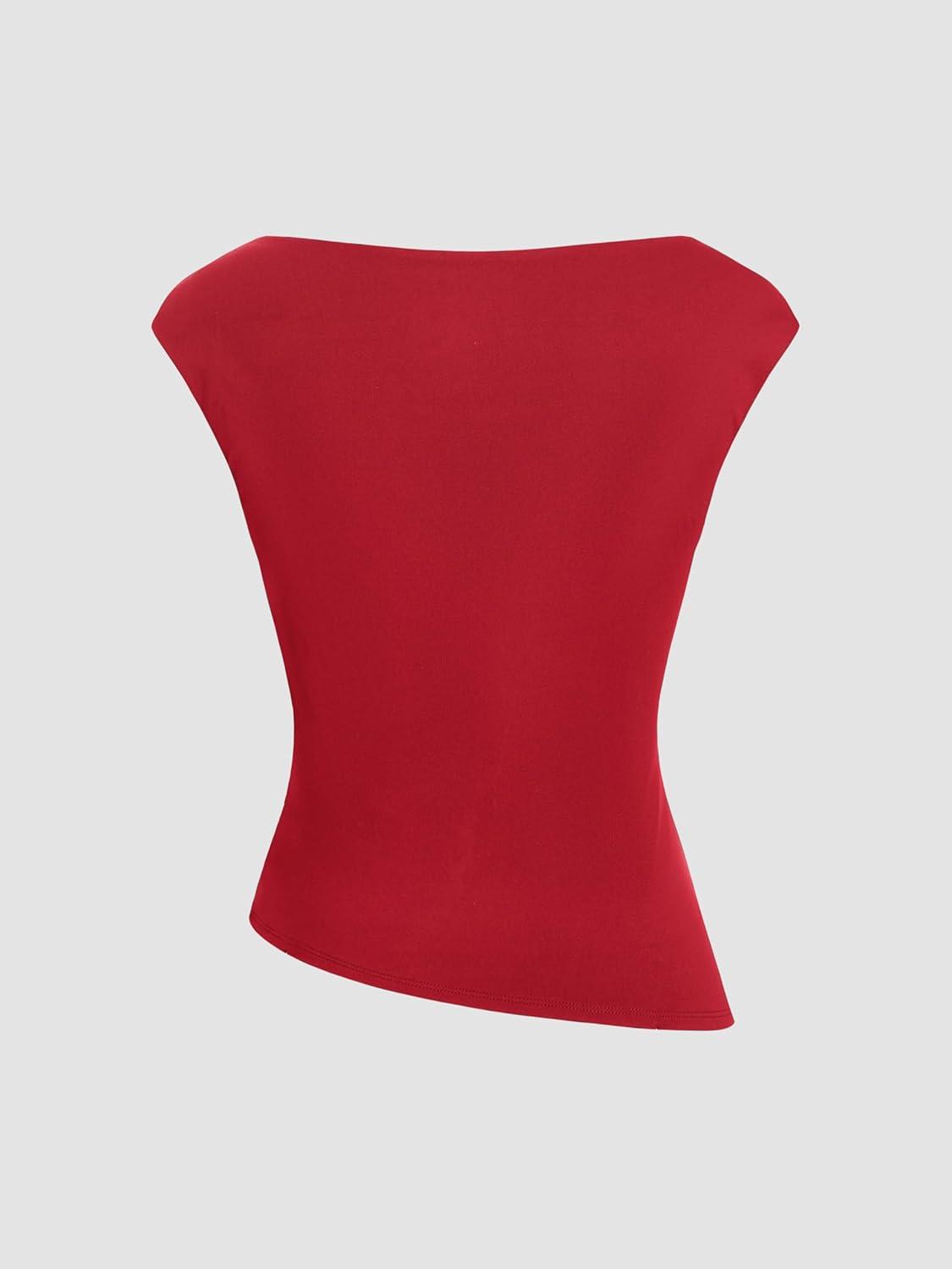 CIDER Women’s Crop Tank Tops Boat Neck Sleeveless Ruched Slim Fit Summer Tops Trendy(Red (Asymmetrical))
