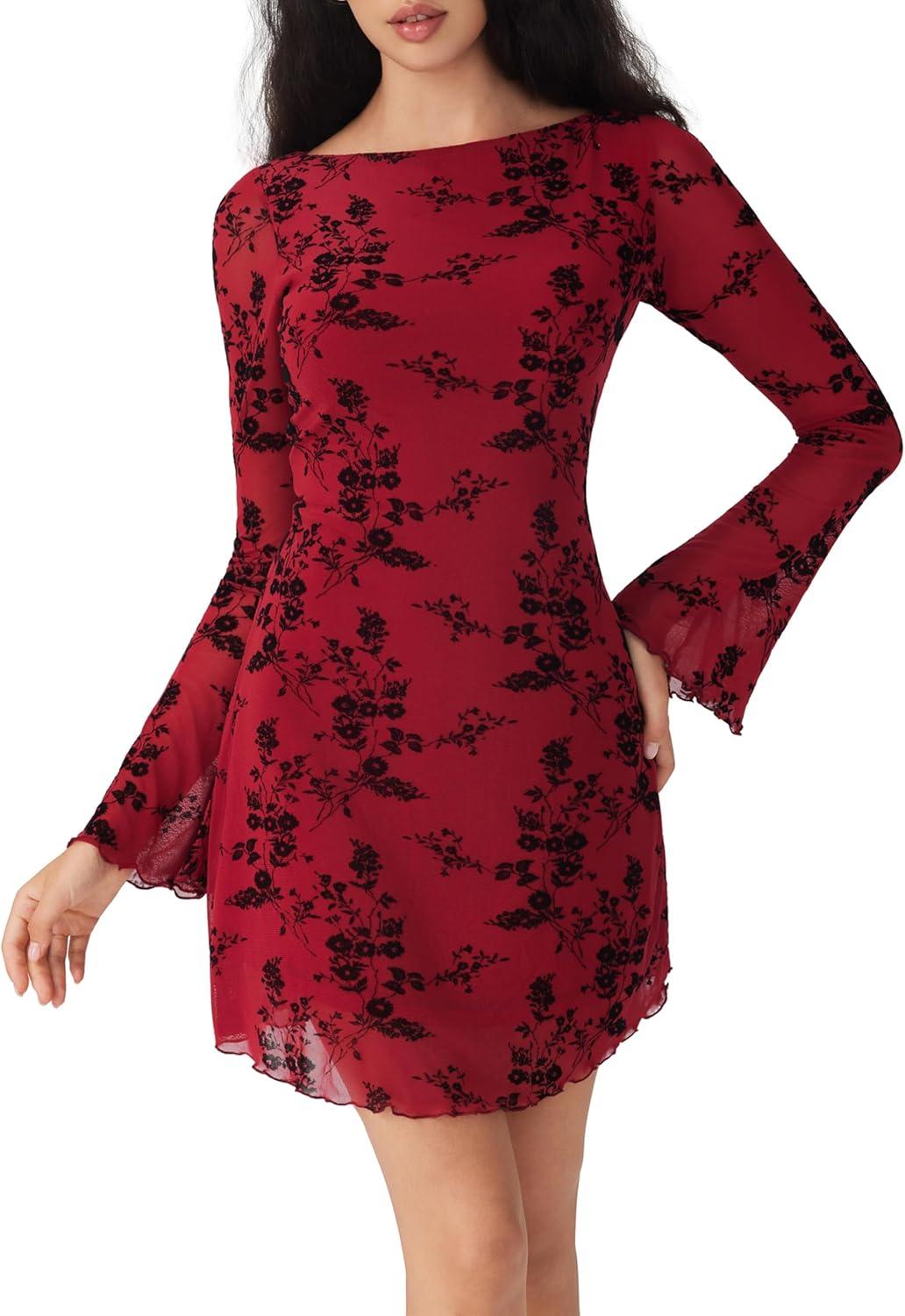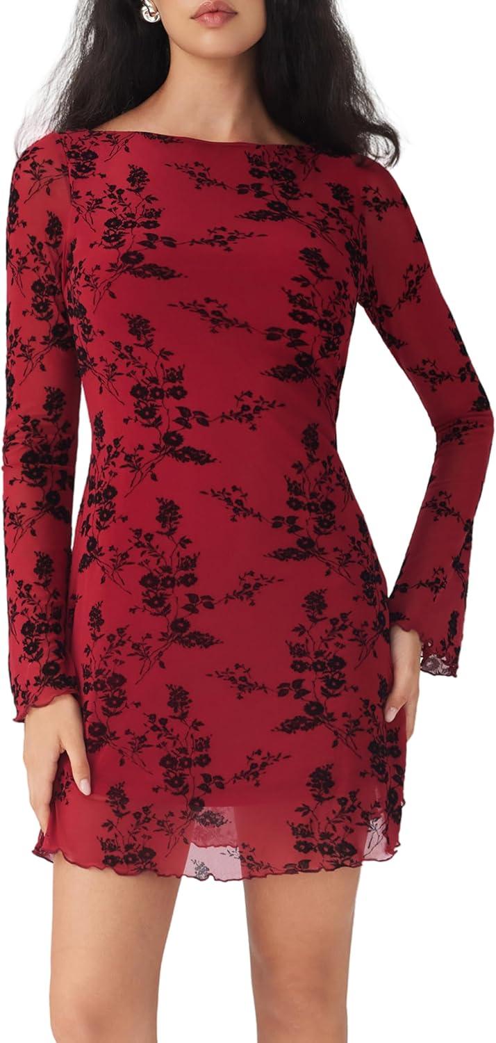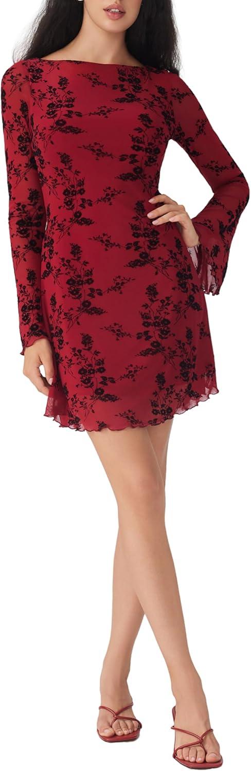 CIDER Womens Floral Mesh Mini Dress Long Sleeve Boat Neck Sheer Party Date Night Dresses Fall Trendy(Red)