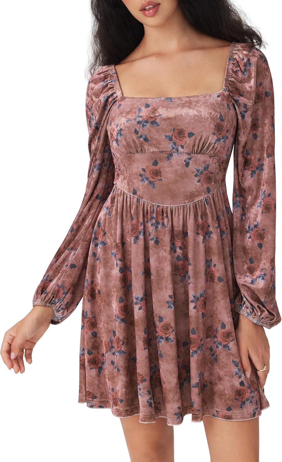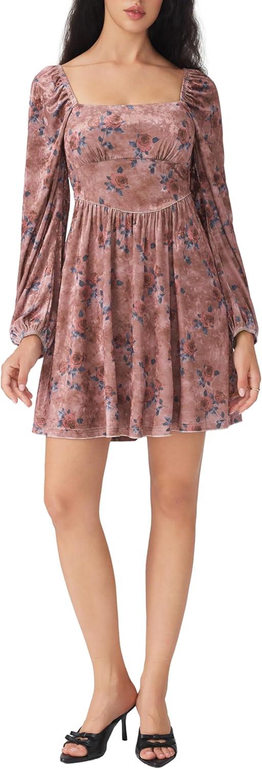 CIDER Womens Floral Velvet Dress Square Neck Long Sleeve Mini Dress(Wine)
