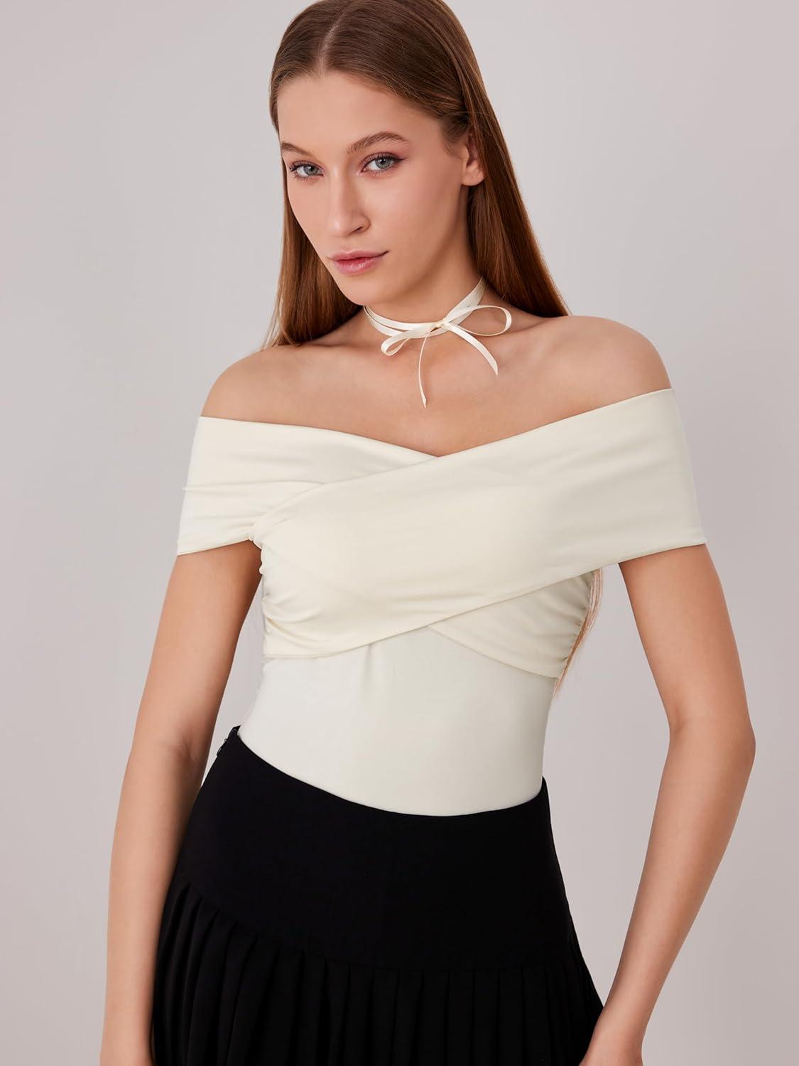 CIDER Women’s French Riviera Vacation Solid Off-shoulder Bodysuit(Khaki)