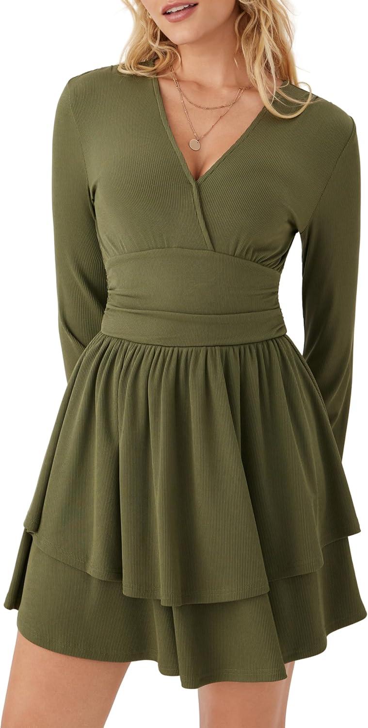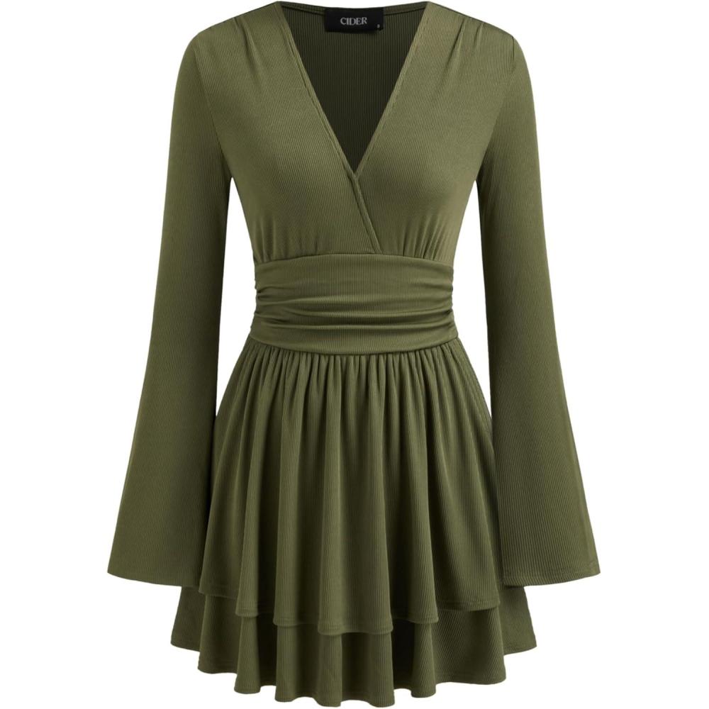 CIDER Womens Long Sleeve V Neck Dress Ruffle Tiered Mini Skirt Casual Dress(Green)