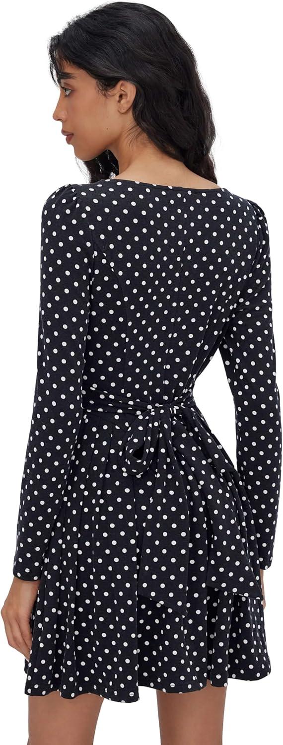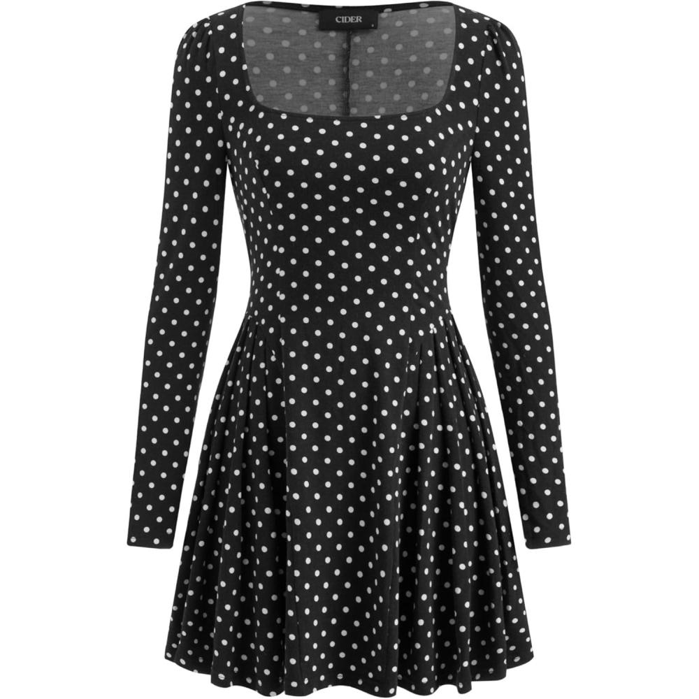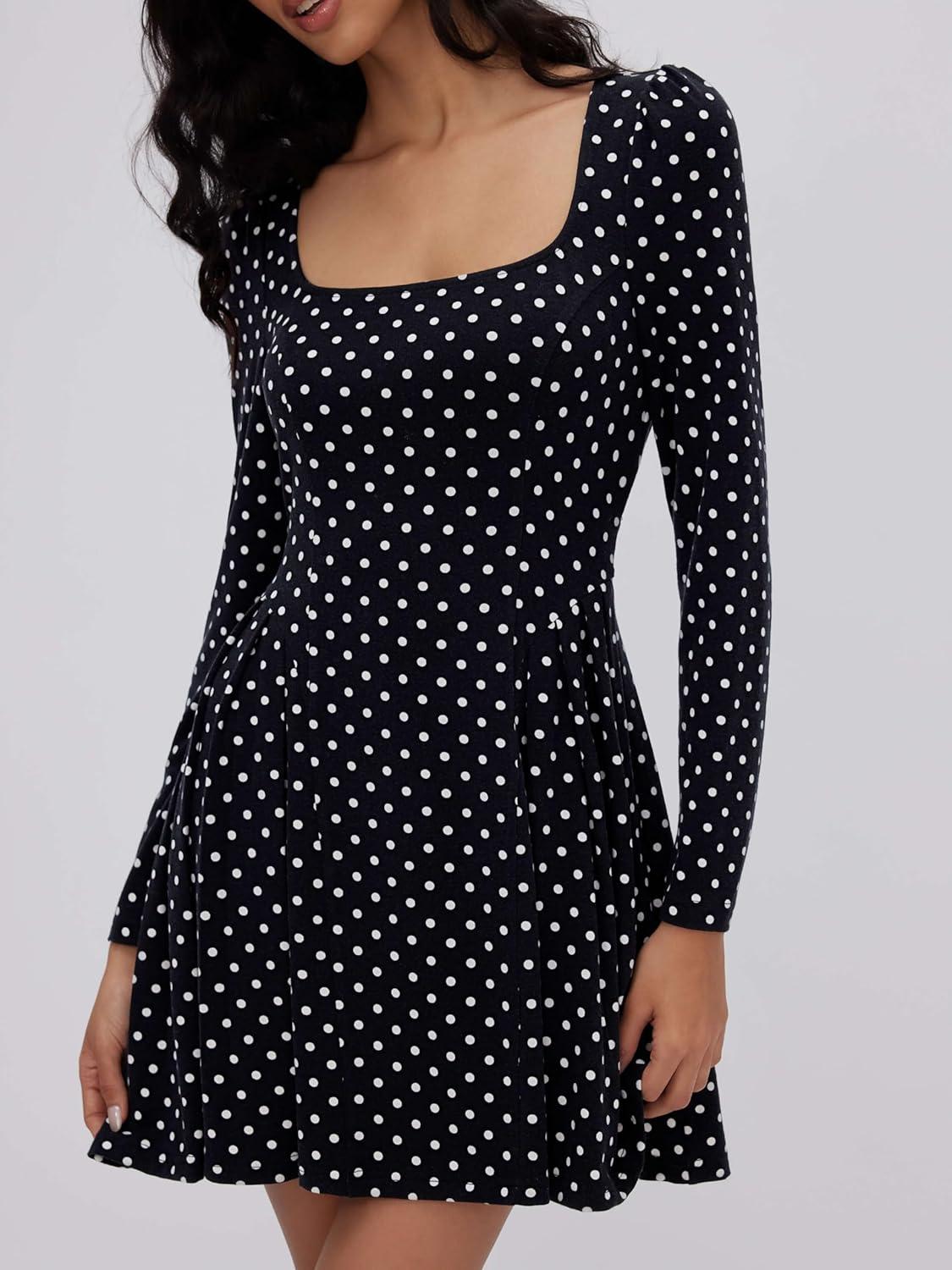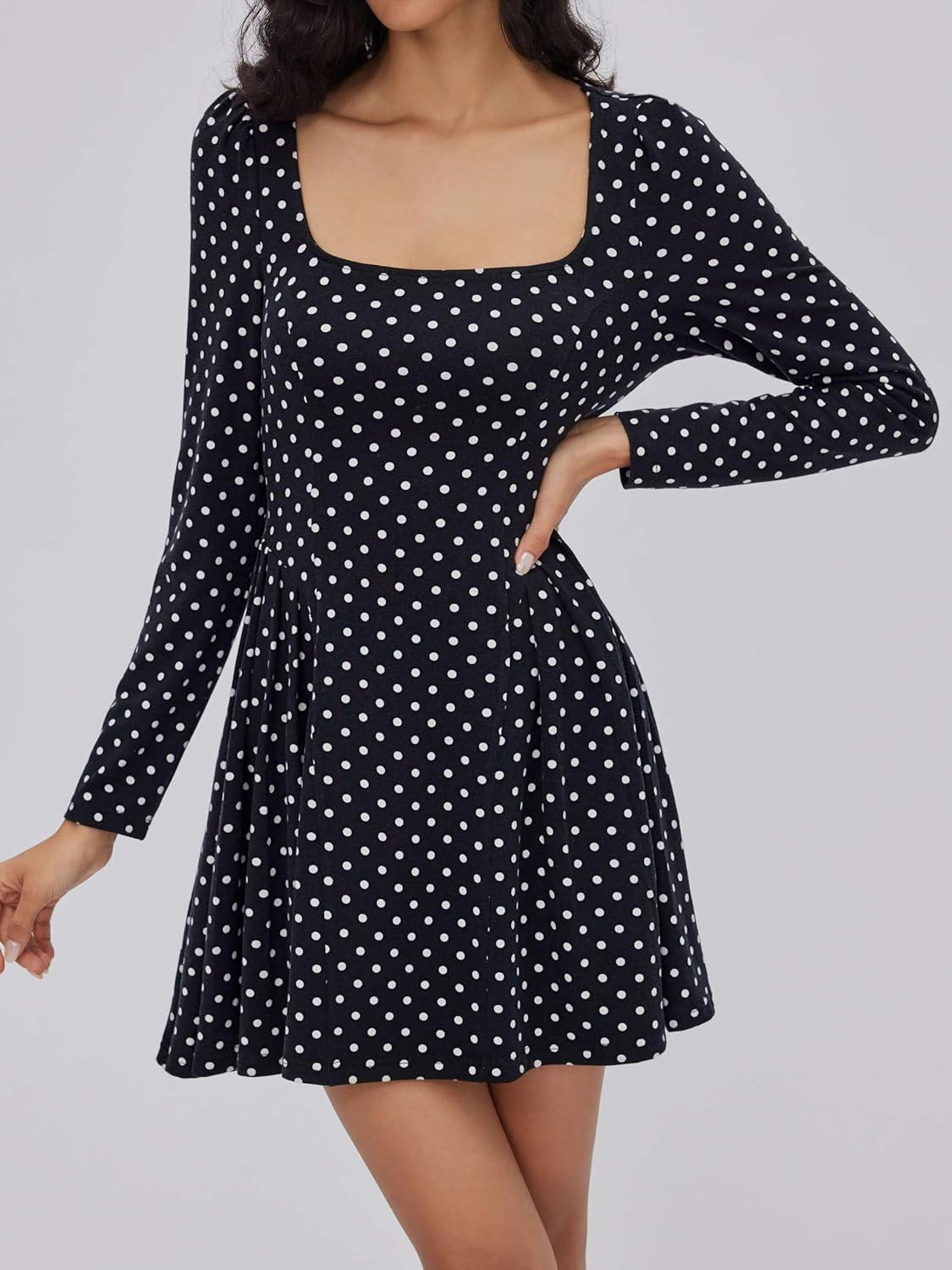 CIDER Womens Polka Dot Dress Long Sleeve Square Neck Drop Waist A Line Casual Party Club Mini Dress(Black)