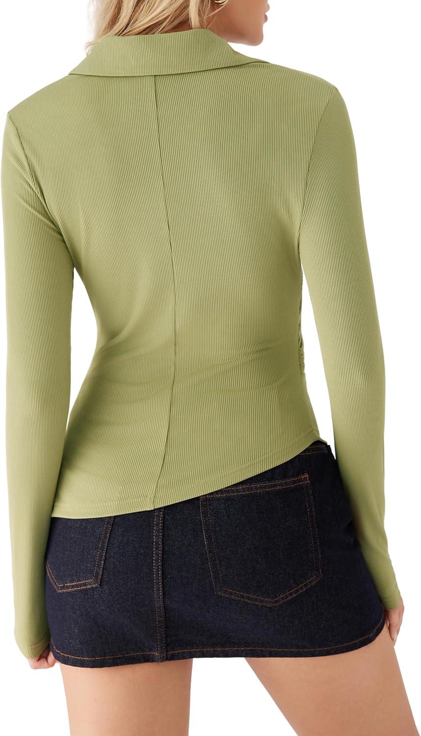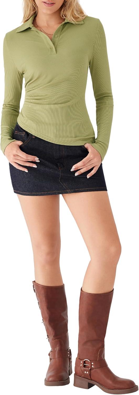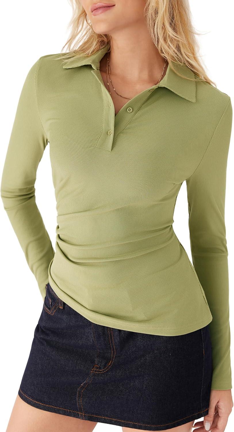 CIDER Womens Ribbed Knit Polo Shirt Long Sleeve Casual Going Out Top(Green)