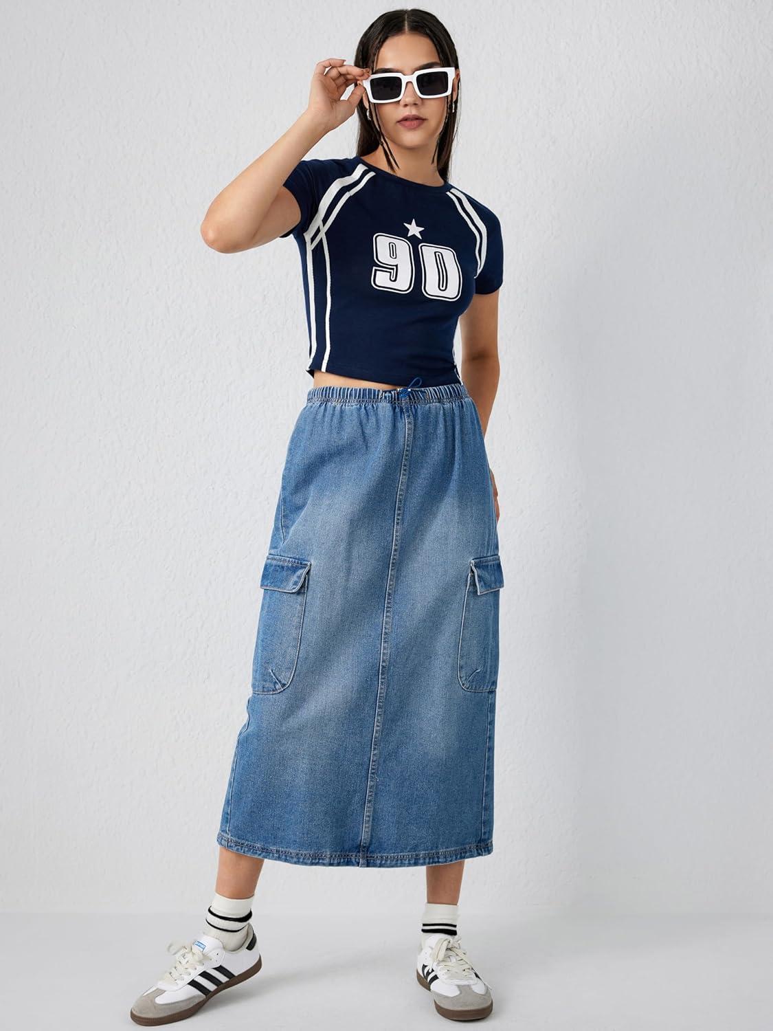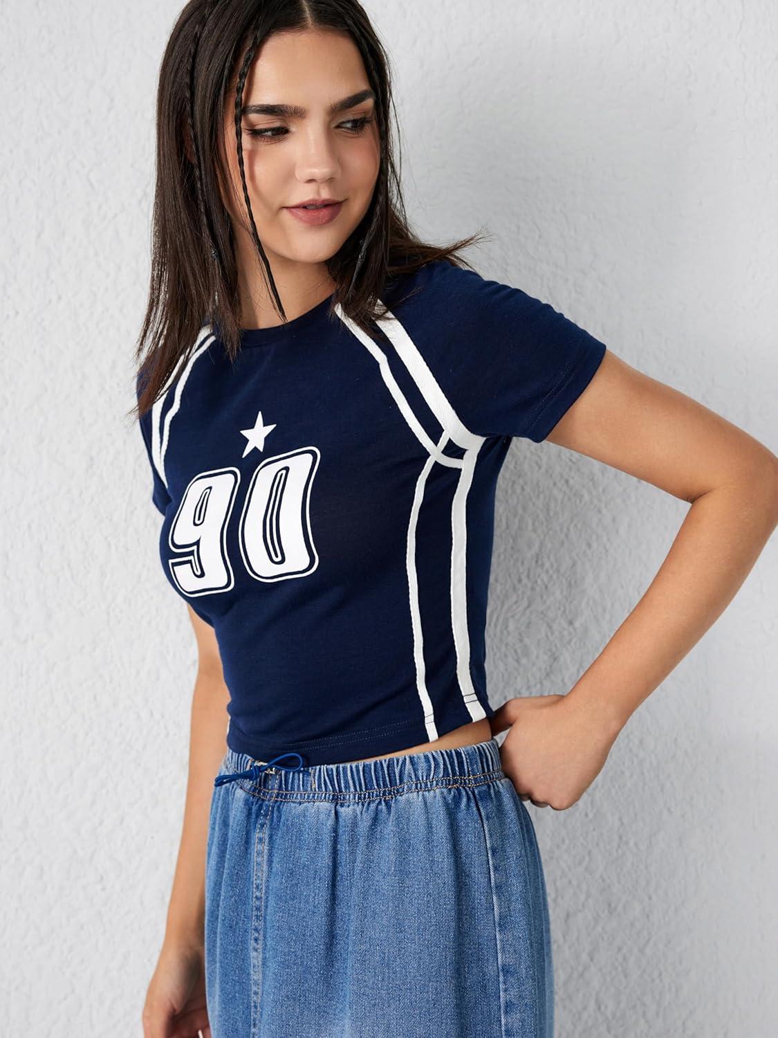 CIDER Women’s Round Neck Graphic Short Sleeve Crop Tee(Blue)