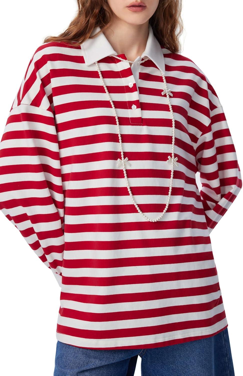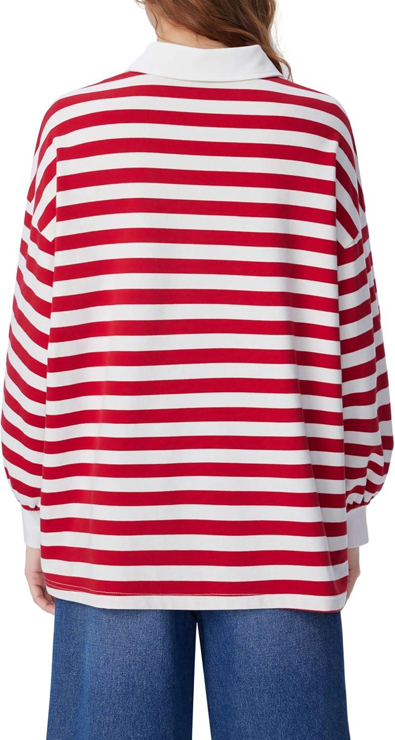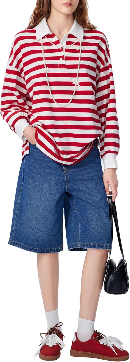 CIDER Women’s Striped Polo Sweatshirt Long Sleeve Y2k Rugby Shirts Casual Oversized Pullover Vintage Fall Streetwear(Red)