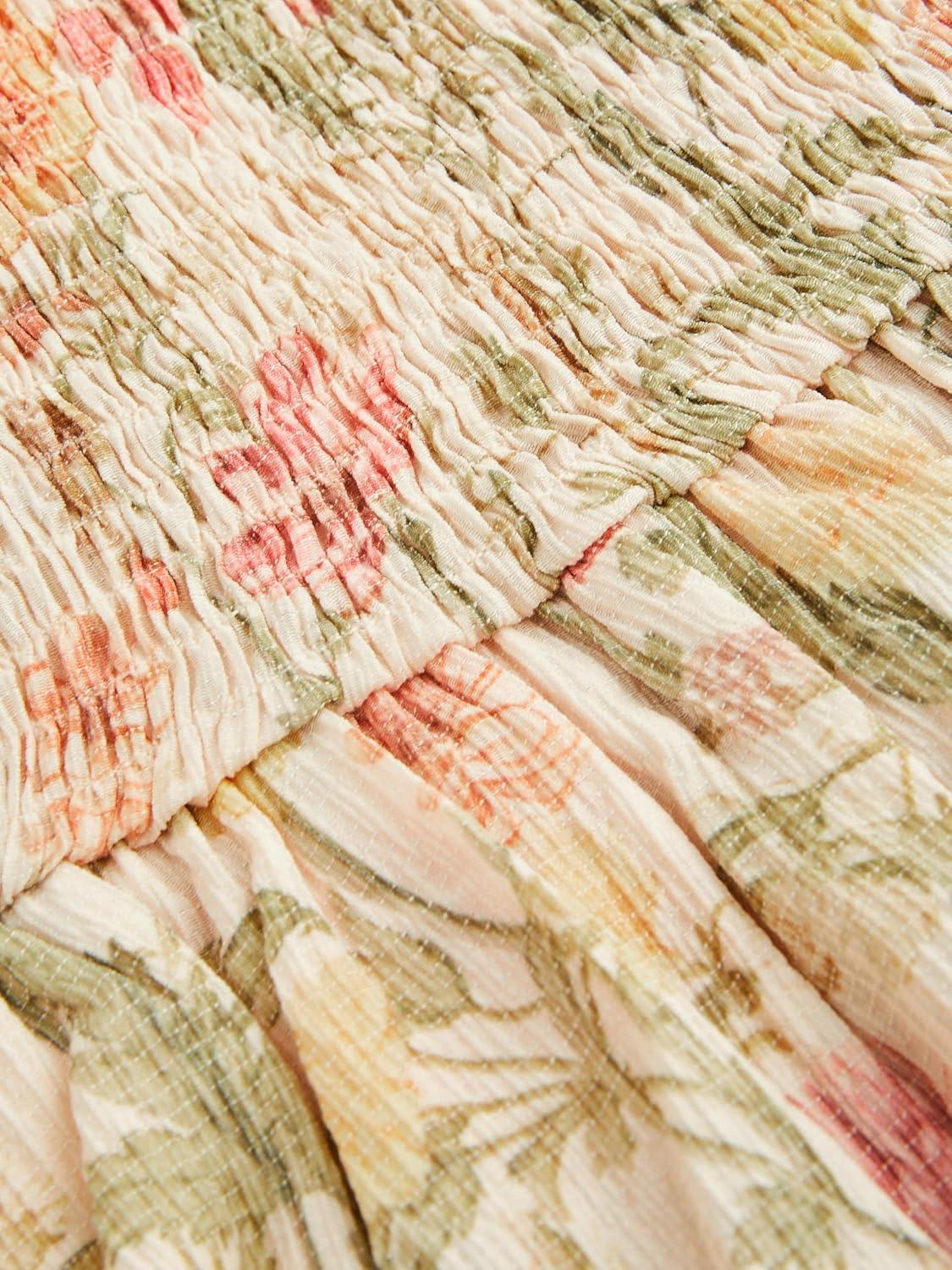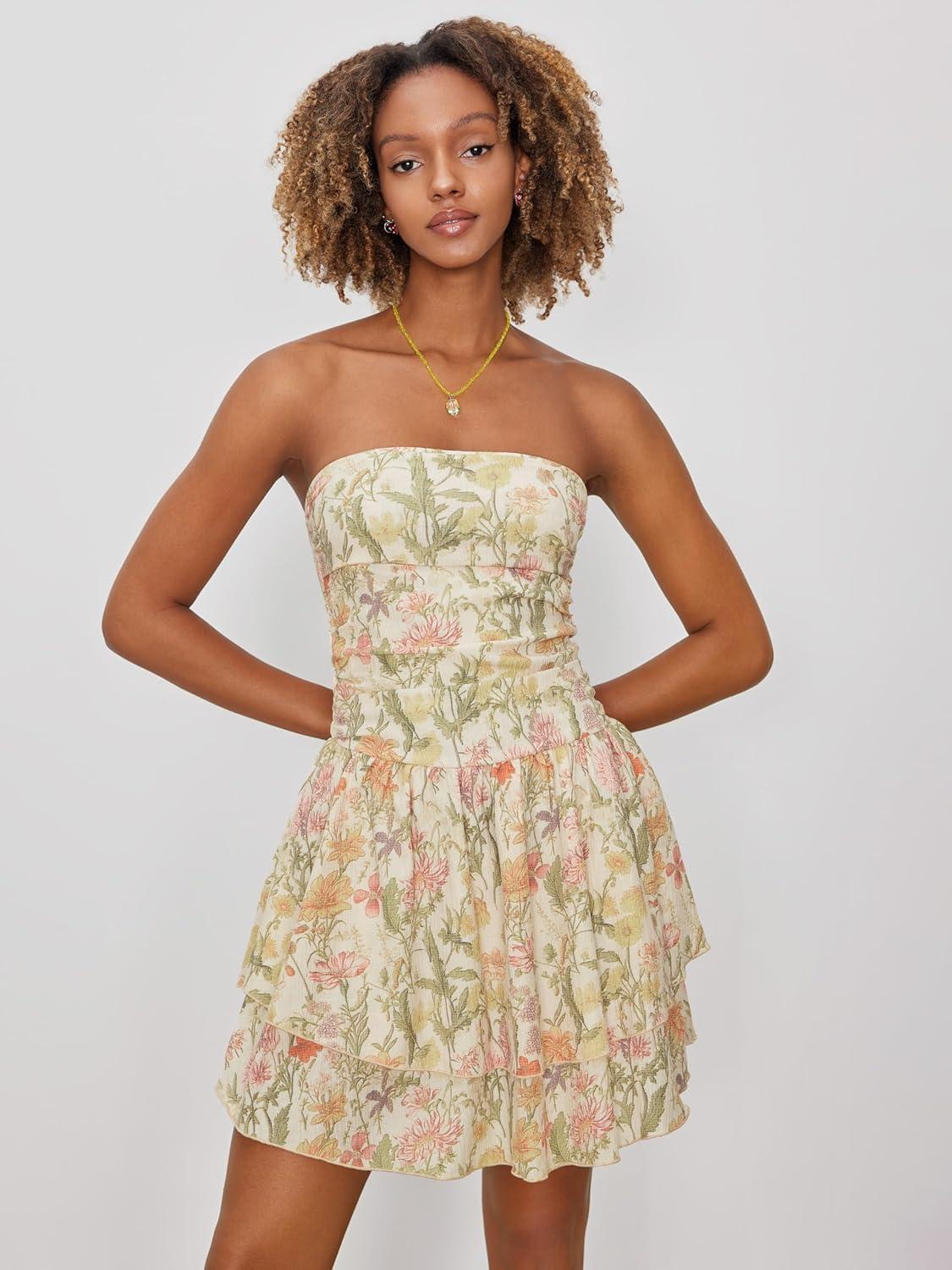 CIDER Women’s Summer Cocktail Dress – Tube Ruched Ruffle Mini Dress(Floral Beige)