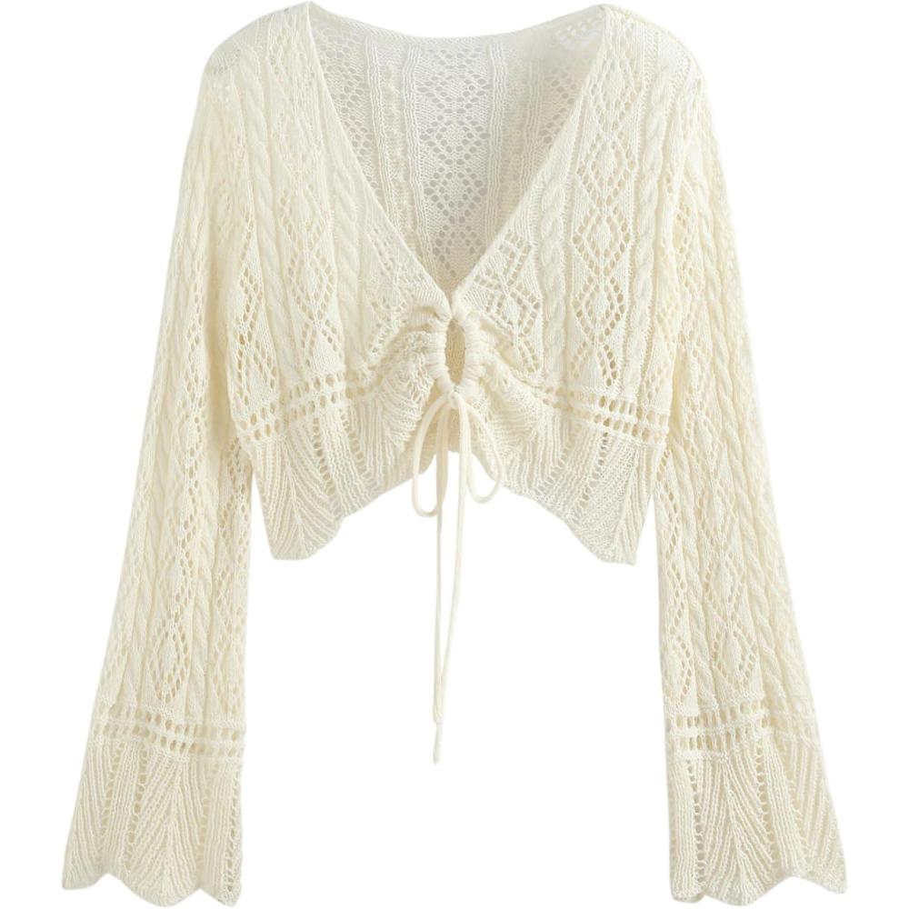 CIDER Women’s V Neck Cropped Sweater Cardigan with Bell Sleeves and Bow Tie Trendy Curve Cardigans Plus Size(Beige)