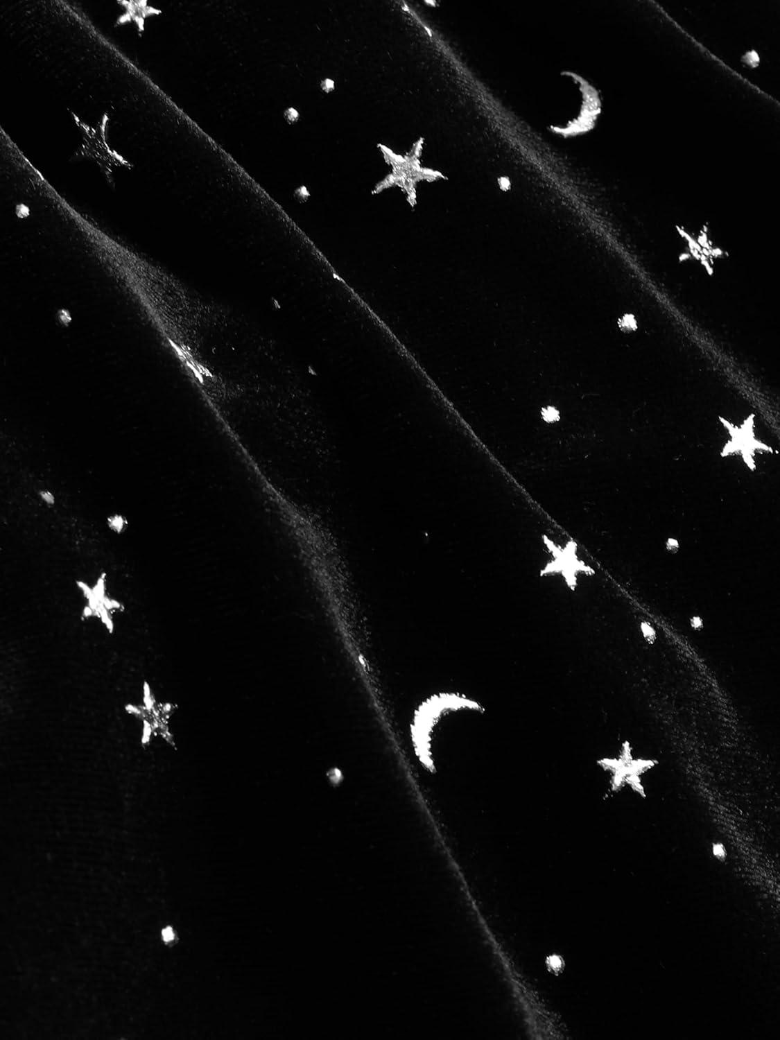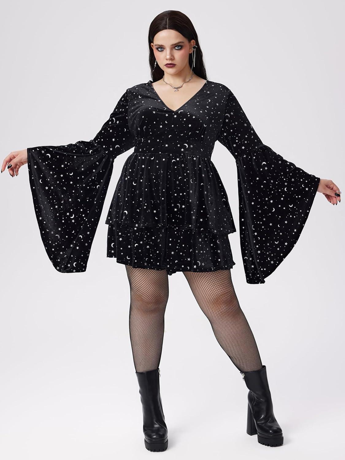 CIDER Women’s Velvet V-neck Star & Moon Pattern Bell Sleeve Romper Plus Size(Black)