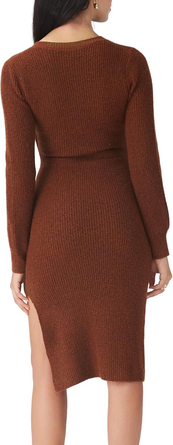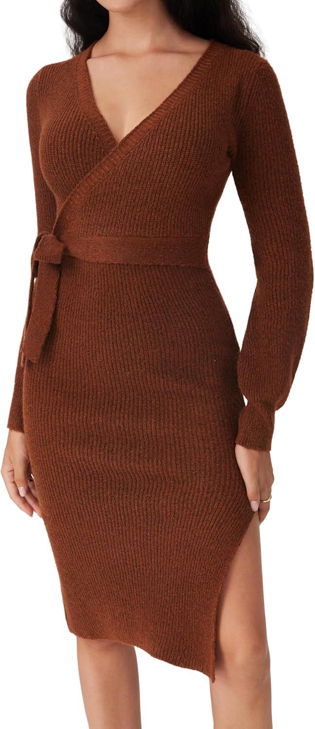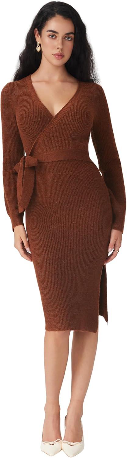 CIDER Women’s Wrap Knit Dress Long Sleeve Tie Waist Midi Sweater Dress(Brown)