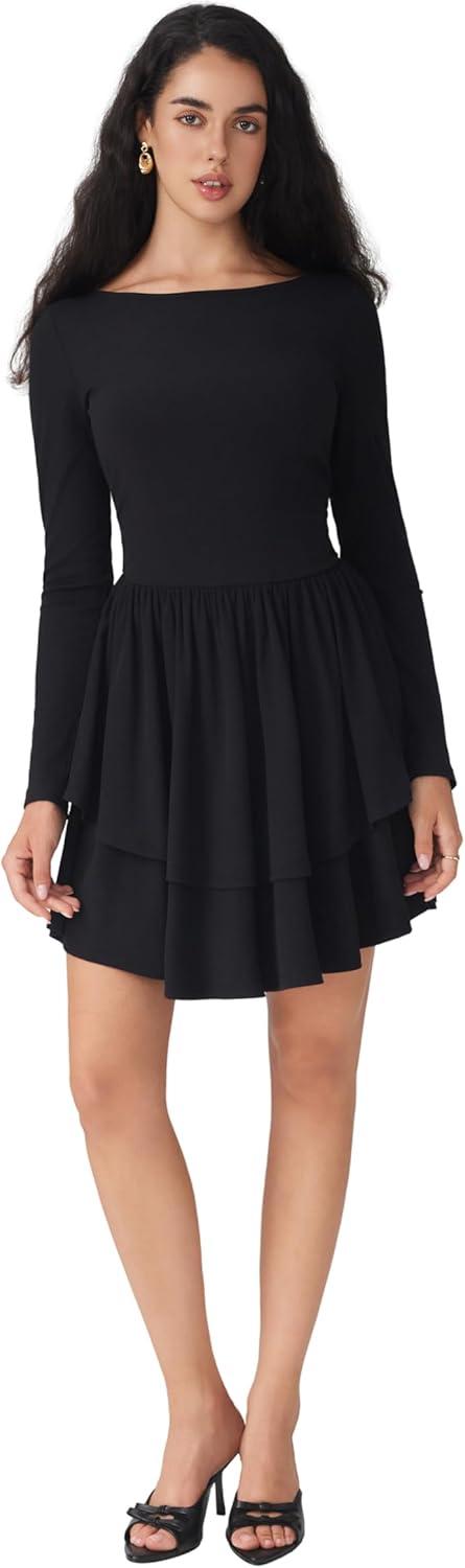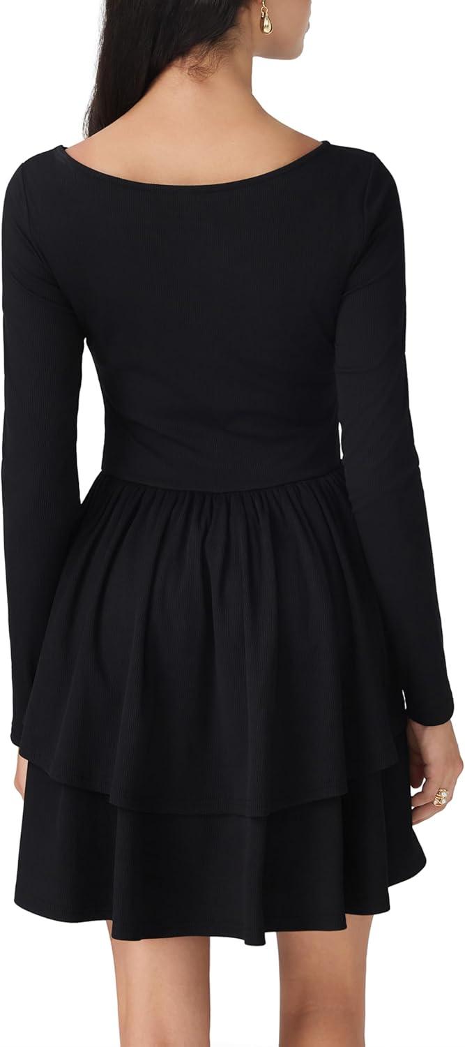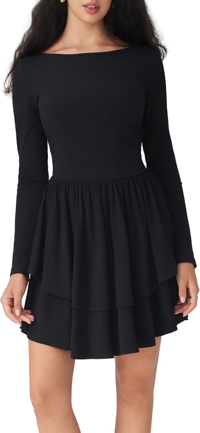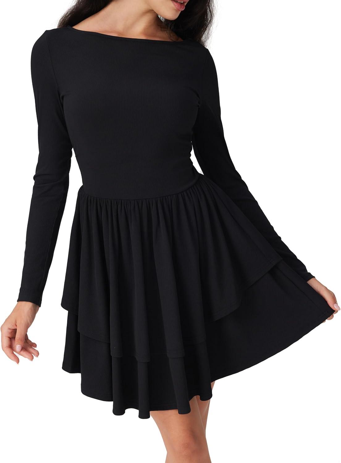 Women Boat Neck Long Sleeve Ribbed Tiered Ruffle Skater Mini Party Cocktail Dress(Black)